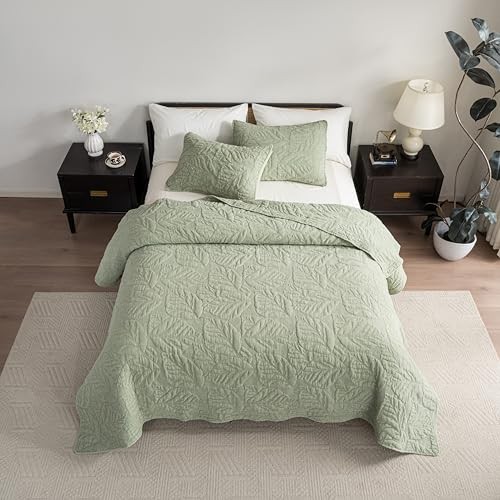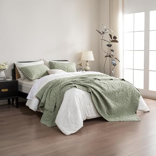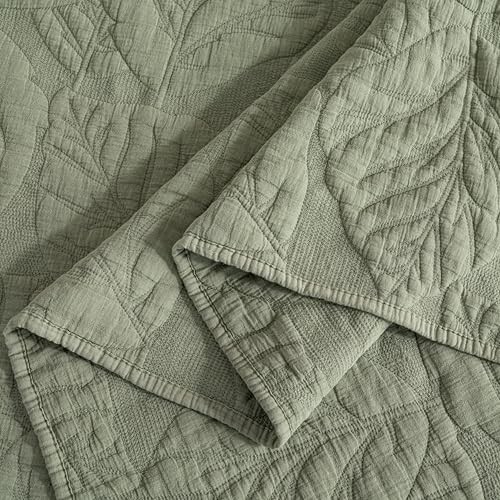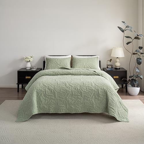 Cotton Quilt Size Green Bedding Set, Water-Washed 3-Piece Queen Green-leaf
