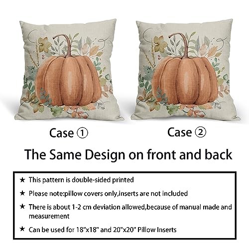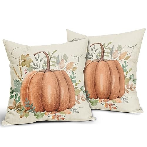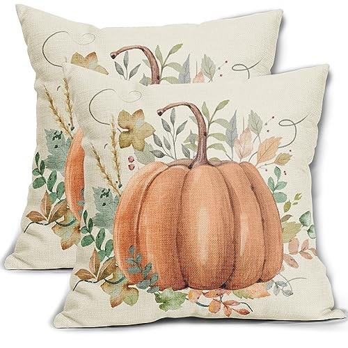 Fall Pillow Covers 18x18 18 x 18 Pack of 2 Watercolor Orange Pumpkin Leaves
