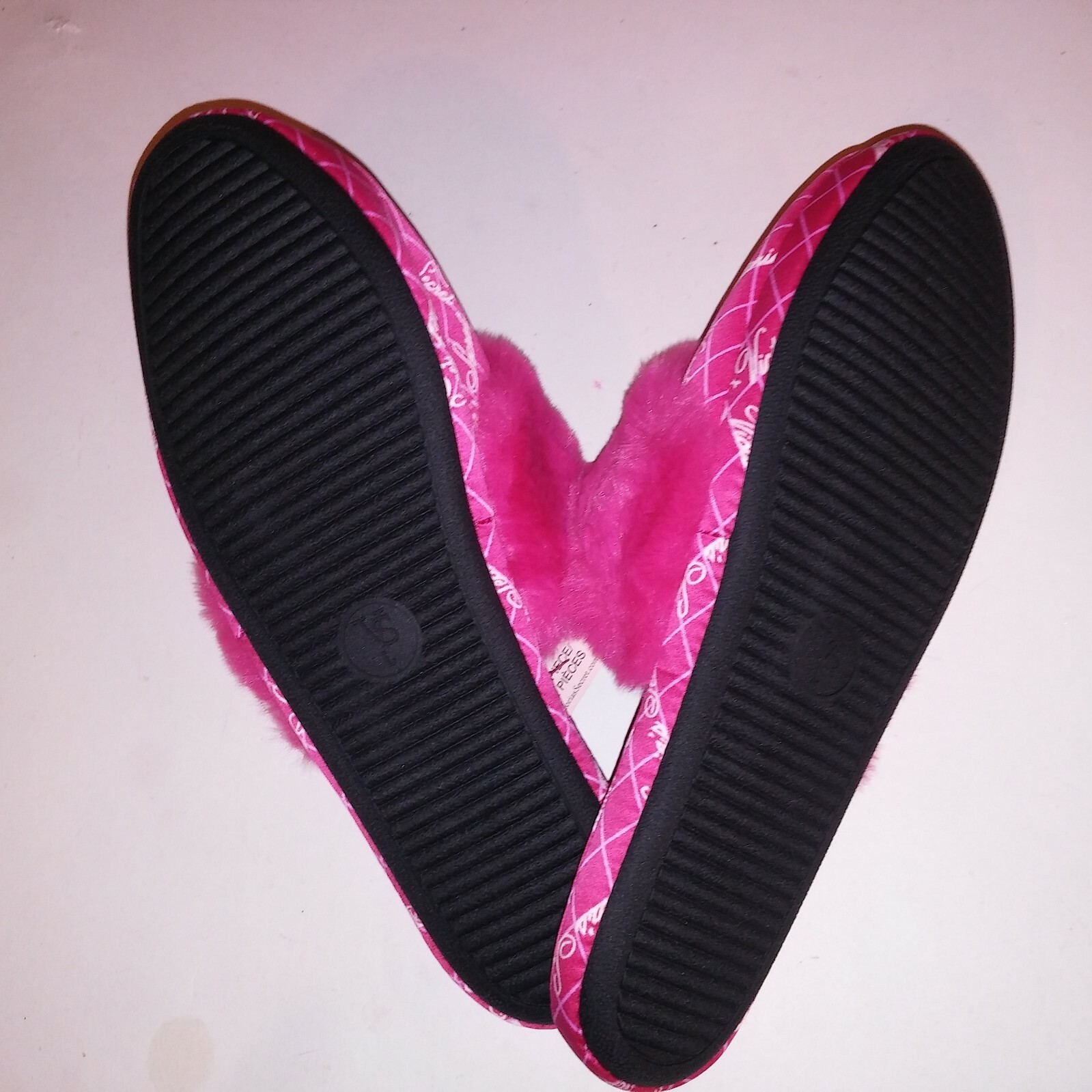 как выглядит Victoria Secret Slippers Large 9 10 Pink Logo Satin Warm Fuzzy Fur Trim New фото