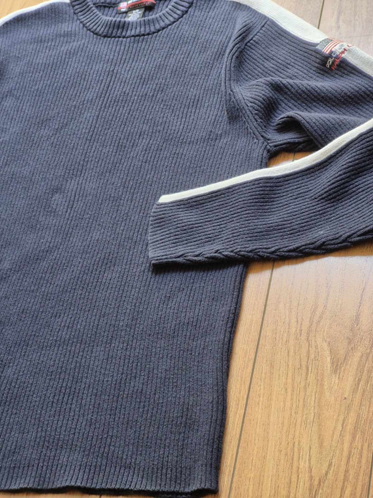 как выглядит Vintage Ralph Lauren Polo Jeans Blue Knit Ribbed Pullover Long Sleeve Sweater фото