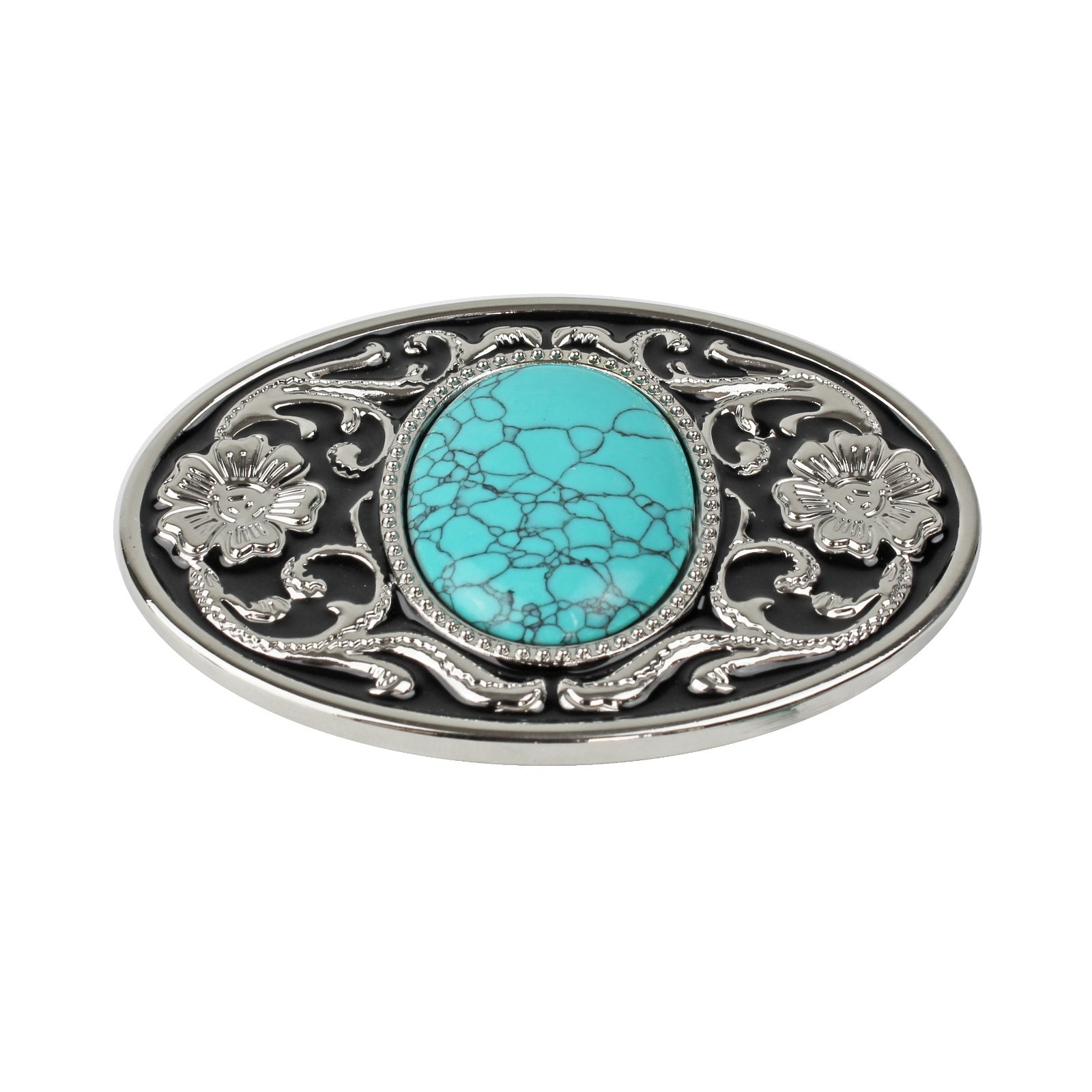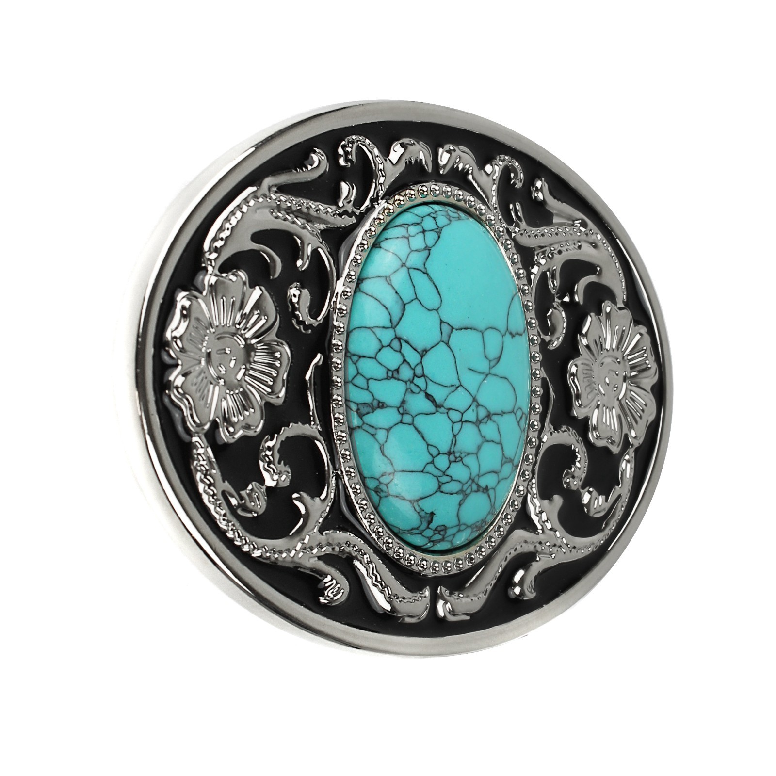 как выглядит Southwestern Oval Turquoise Floral Belt Buckle Silver Tone With Black Enamel фото