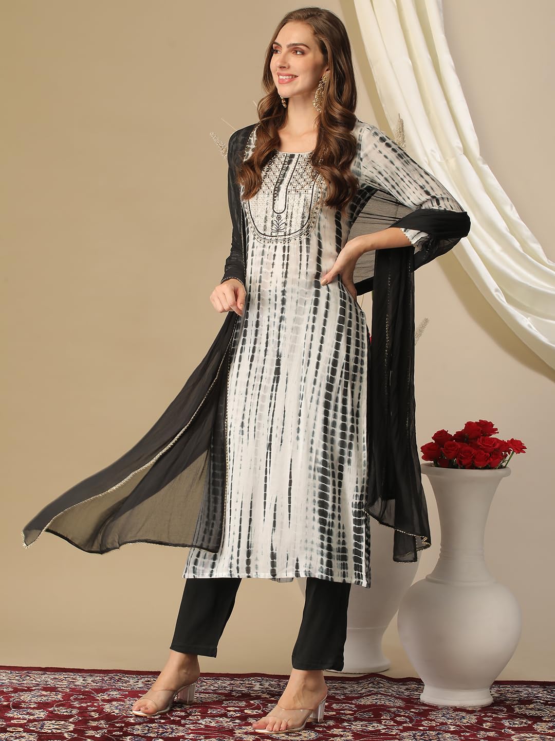 Gosriki Women'S Rayon Blend Straight Printed Kurta With Pant Dupatta Tiedy...