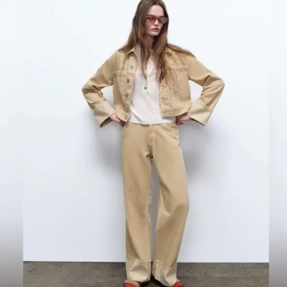 как выглядит NWOT Zara High Waist Cuffed Wide Leg Tan Jeans 6045/038 Bloggers Fave SZ-6 фото