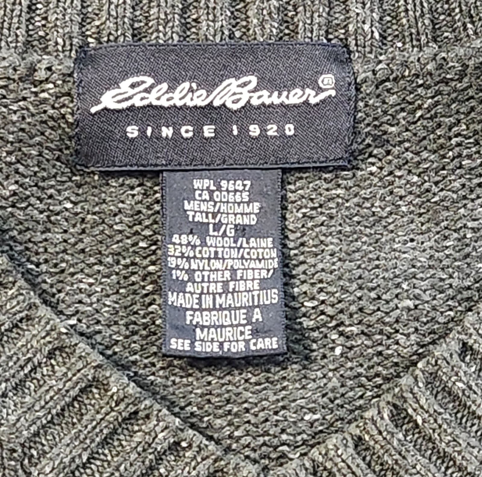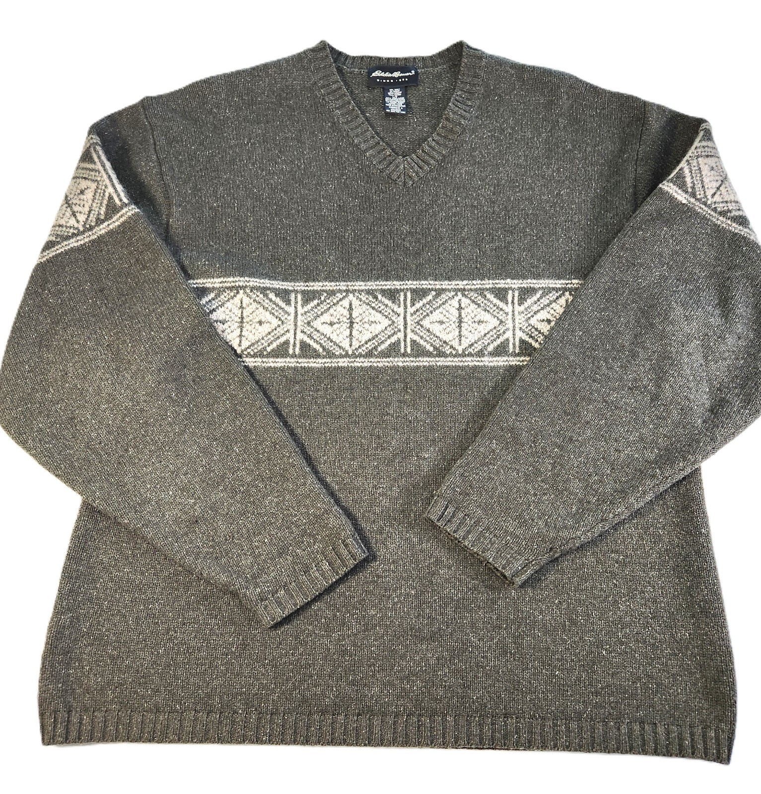EDDIE BAUER Mens Tall L Wool Blend Fair Isle Olive Vneck Nordic Pullover Sweater