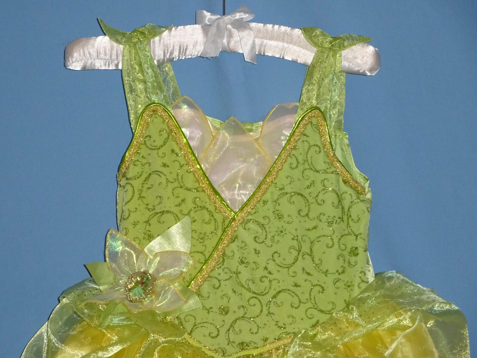 как выглядит DISNEY PRINCESS TIANA DELUXE COSTUME DRESS-GIRLS 3T-4T/4-6X-HAIR BOW-ACCESSORIES фото