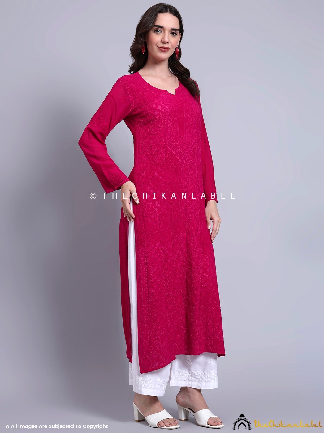 Pink Viscose Chikankari Straight Kurta, Lucknowi Chikan Handmade Kurti for Women