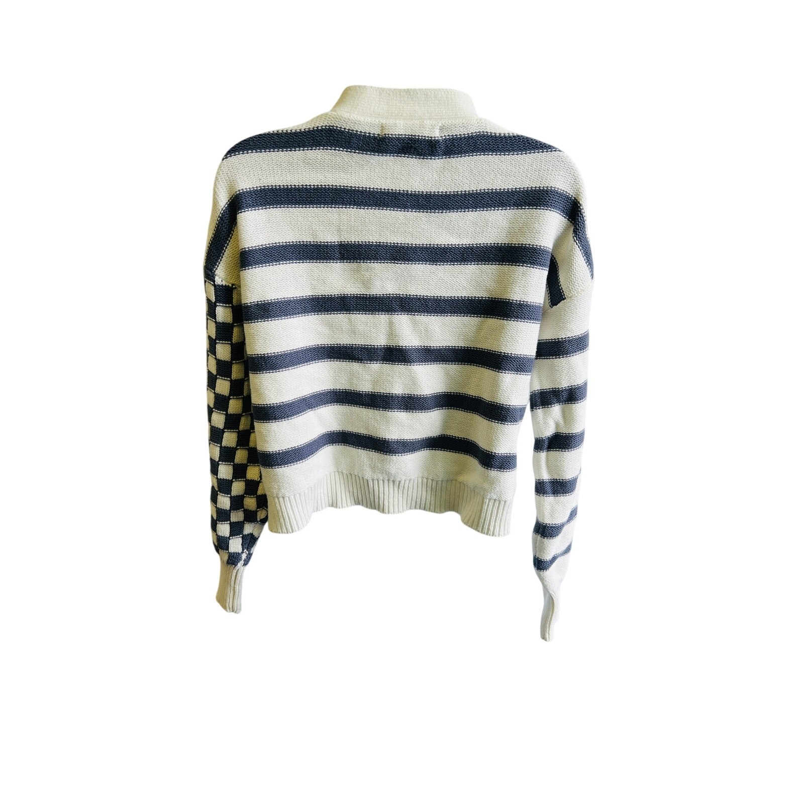 Moon Madison checker stripe knit cardigan sweater cream navy M cozy Y2K