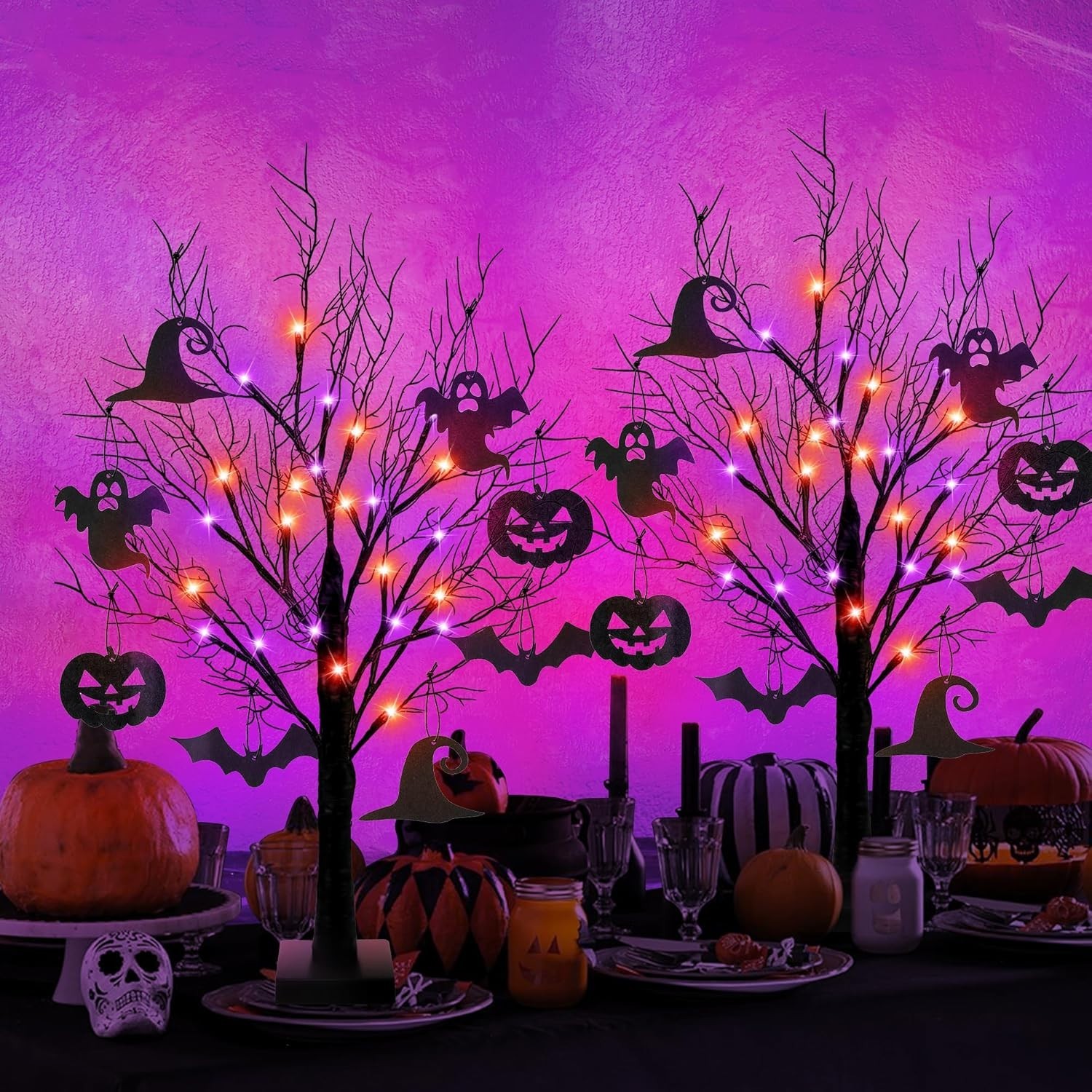 2 Pack Halloween Tree, Black Tree with Orange Purple Bi-Color Led Lights 6 Func
