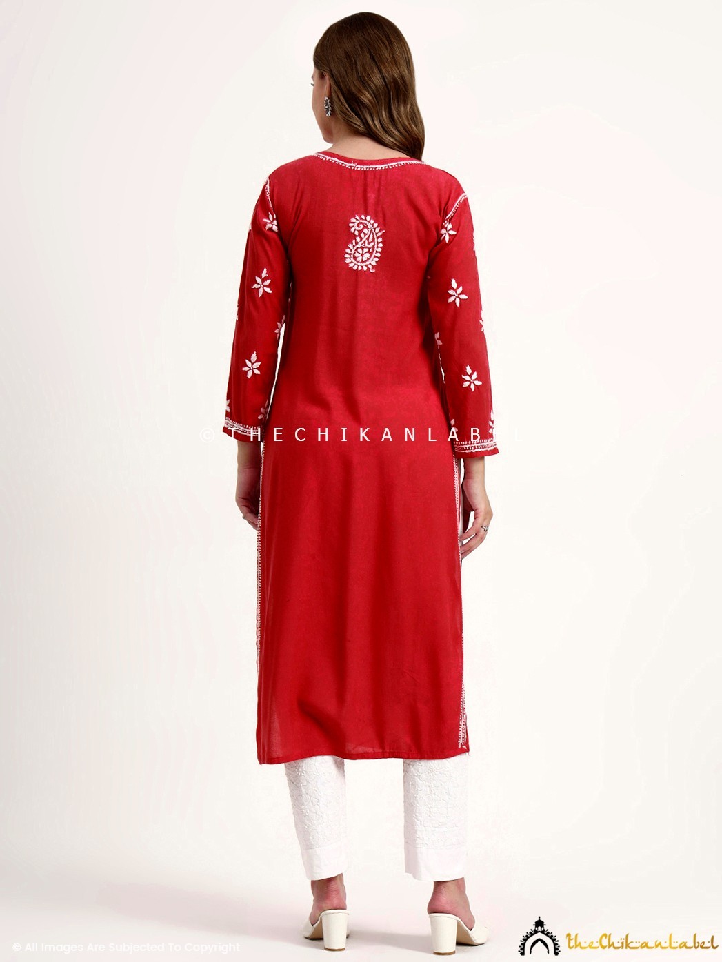 Red Rayon Chikankari Kurta for Women, Lucknowi chikan Hand-Embroidered Kurti