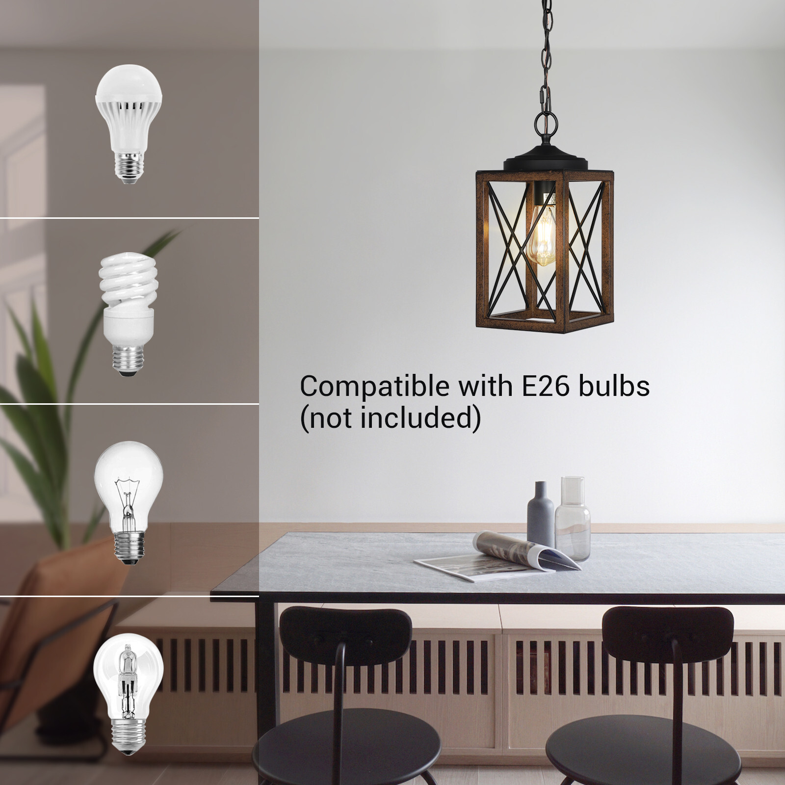 EDISHINE Farmhouse Pendant Light, Metal Hanging Light Fixture with Wooden Grain