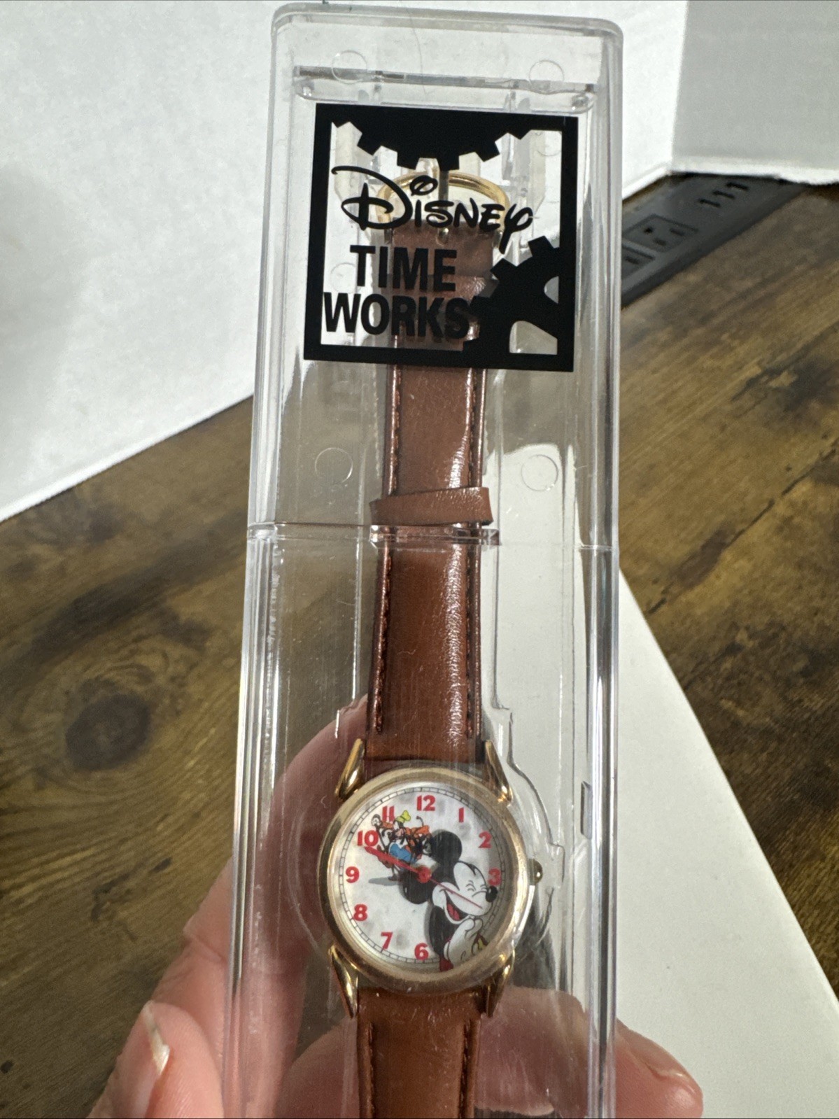 • Vintage Disney Time Works Mickey and Goofy New Brown Leather Band Rare