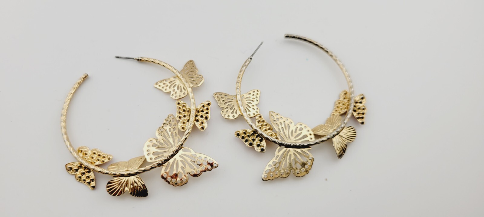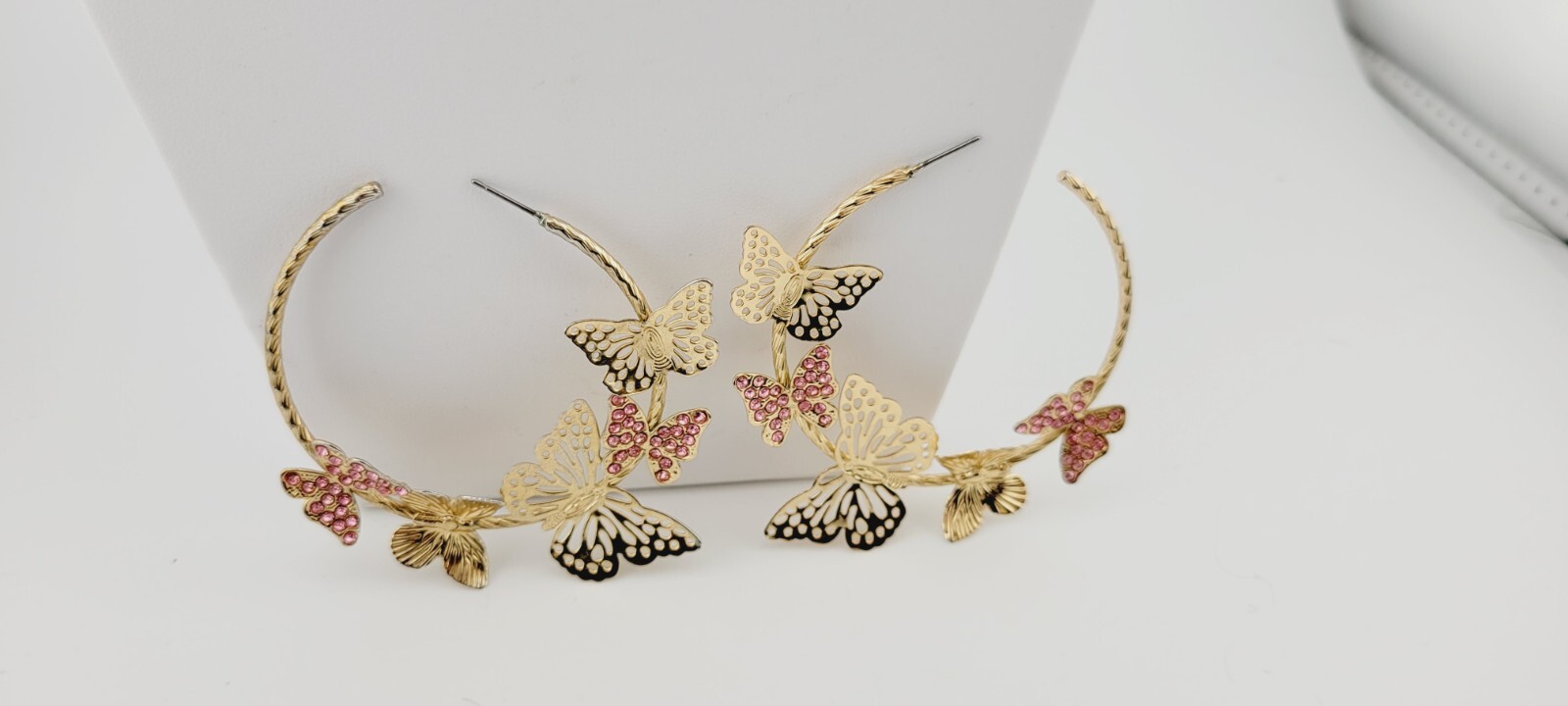 как выглядит Butterfly 2.5" hoop earrings gold tone pink crystals фото