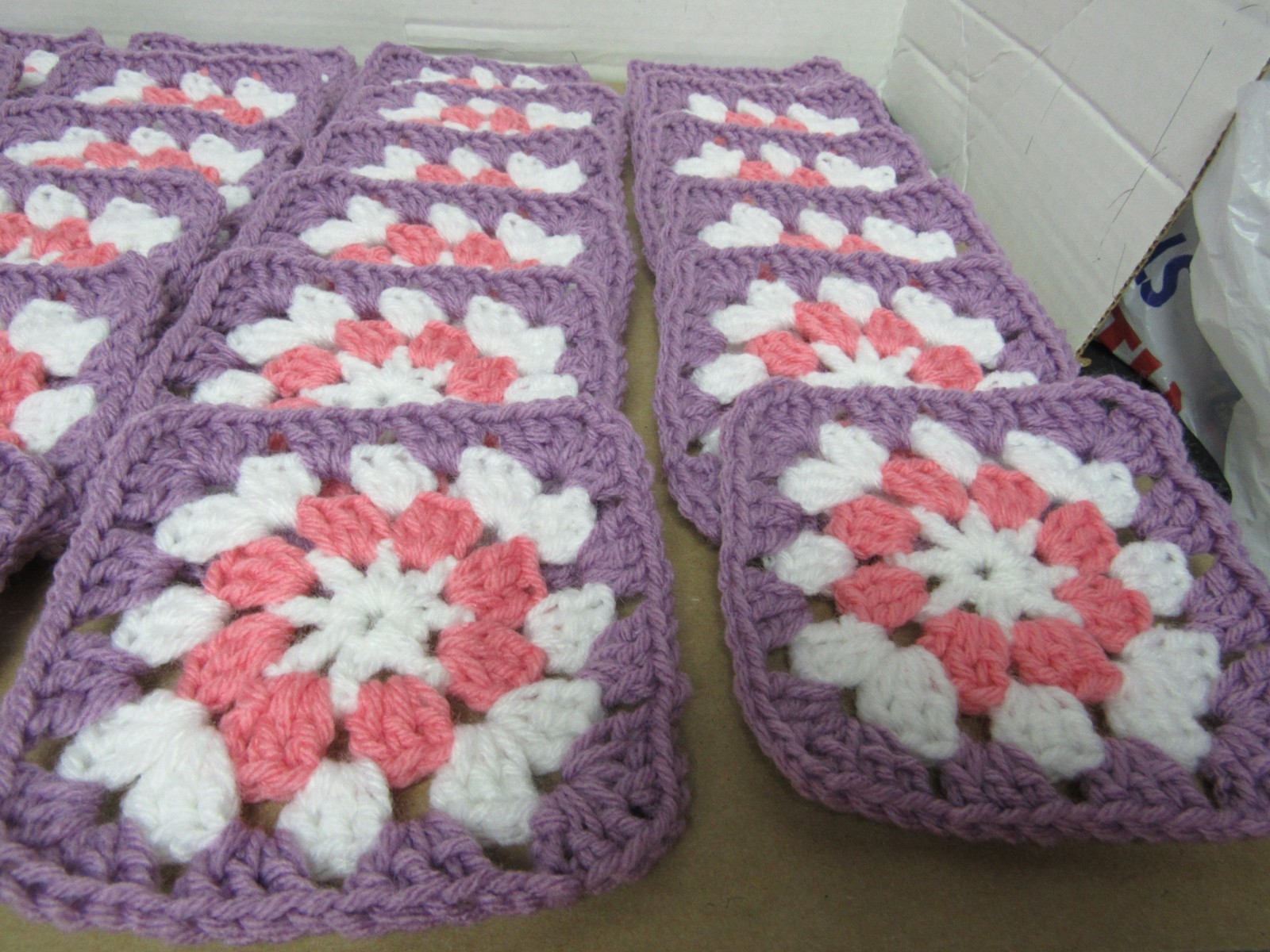 Lot of 24, 5 , Colors Pink, Purple and White Crochet Floral Squares Blocks