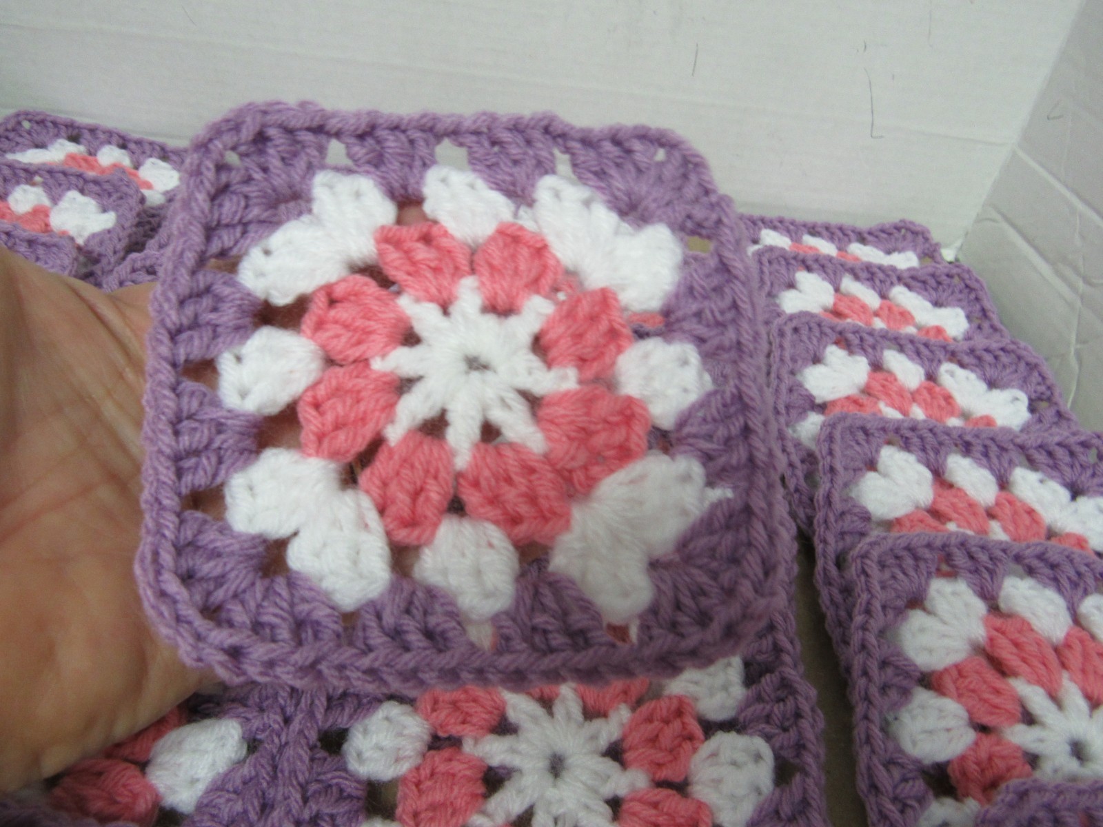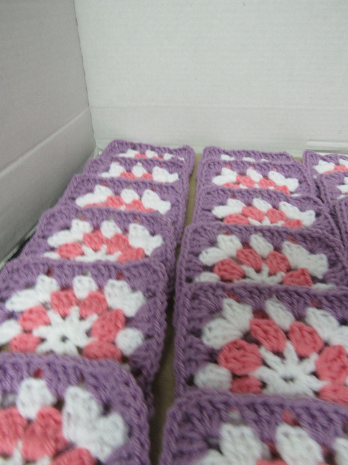 как выглядит Lot of 24, 5 , Colors Pink, Purple and White Crochet Floral Squares Blocks фото