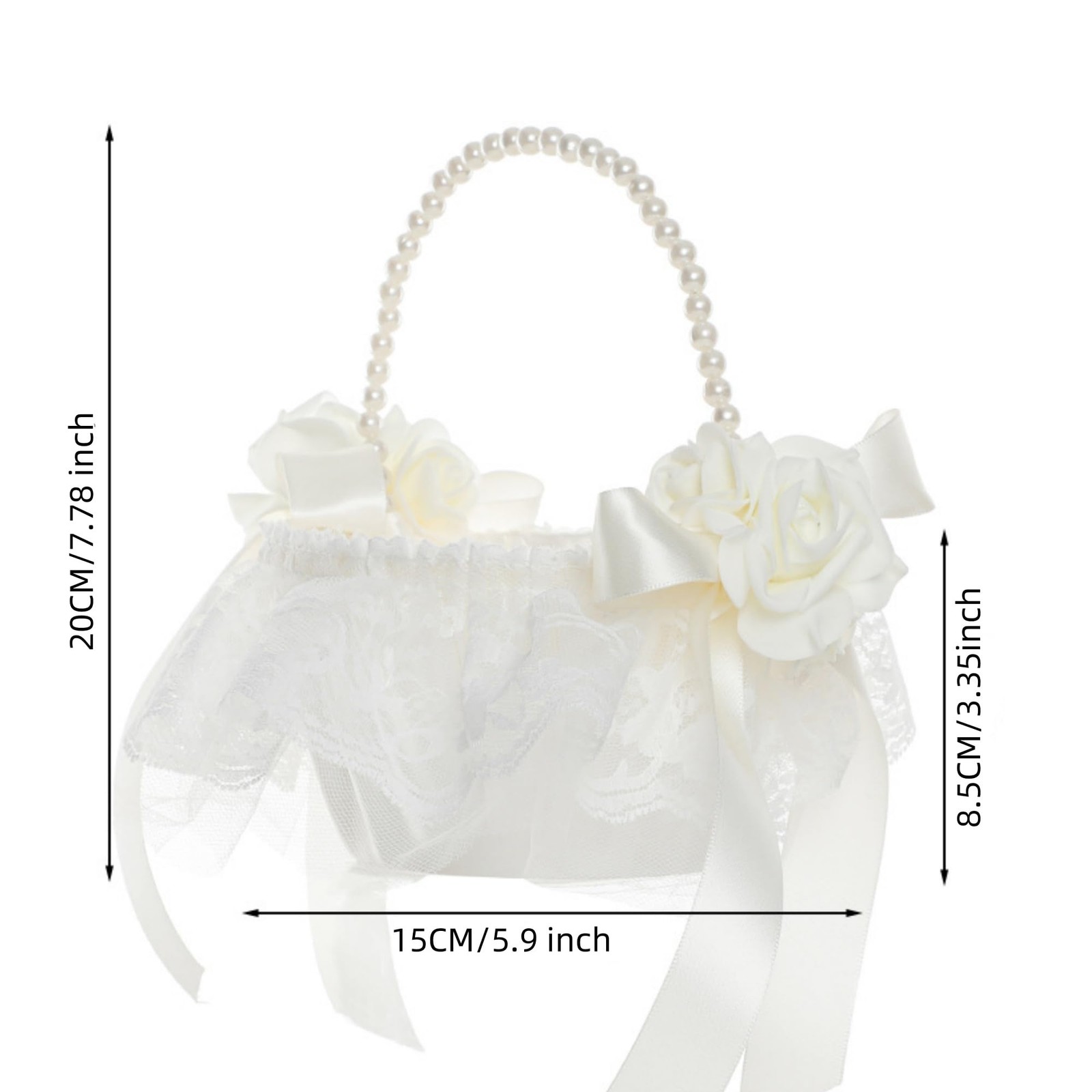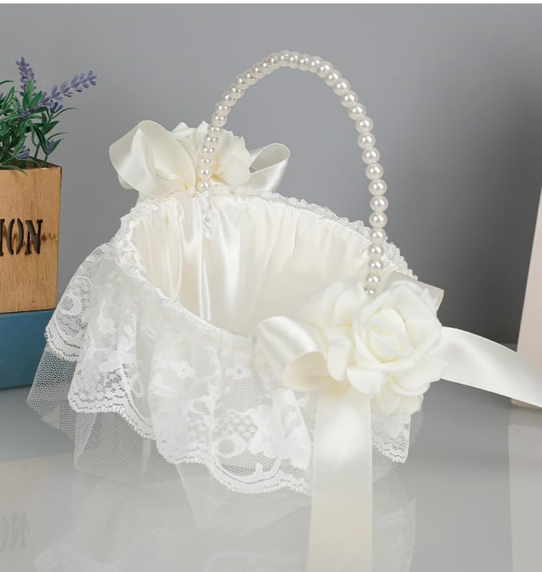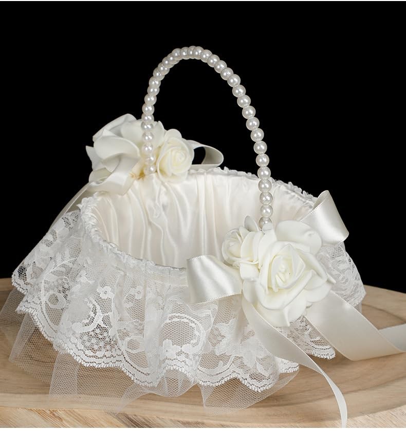 White Satin Flower Girl Basket with Pearl Handle for Wedding Ceremony Decor