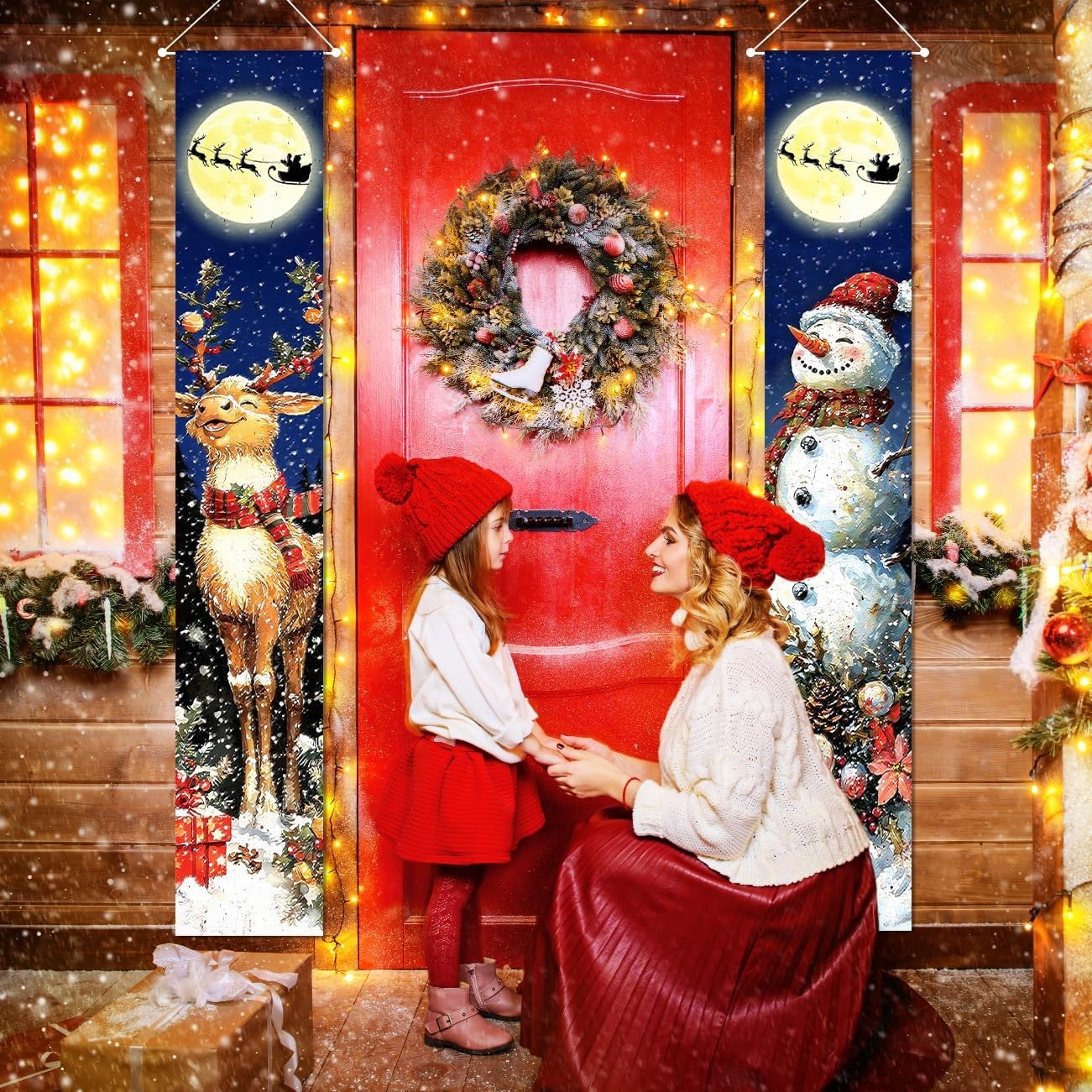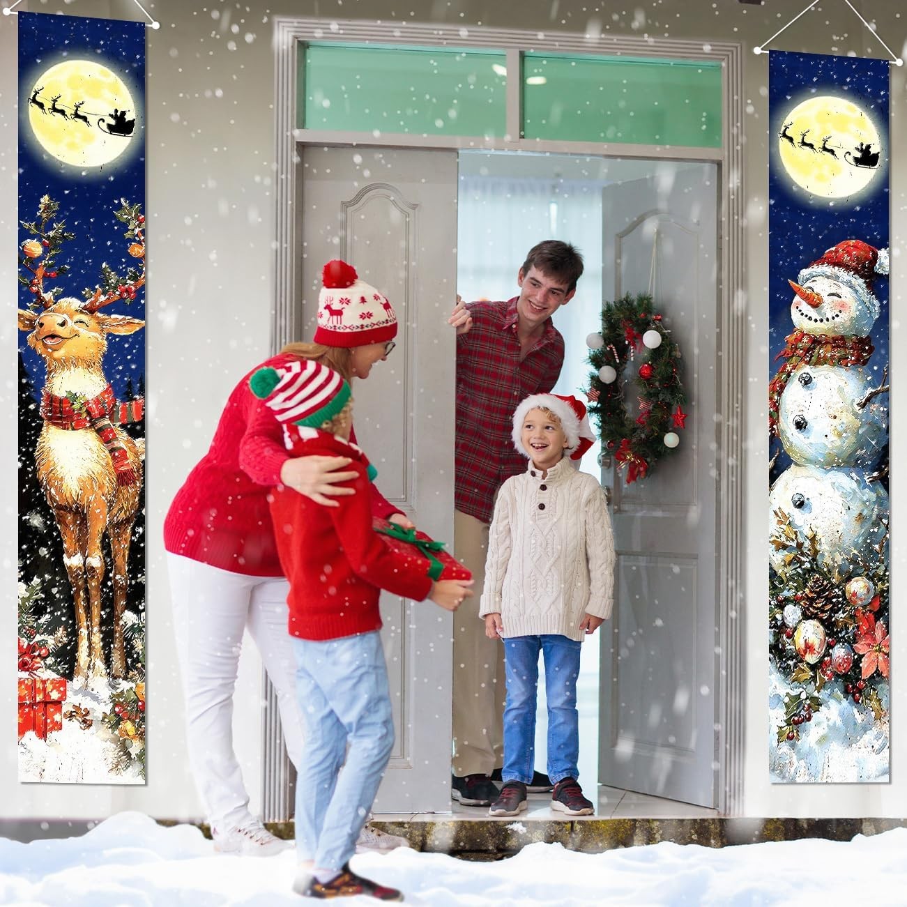 Retro Christmas Decorations Merry Christmas Door Banner Blue Snowman Reindeer Mo