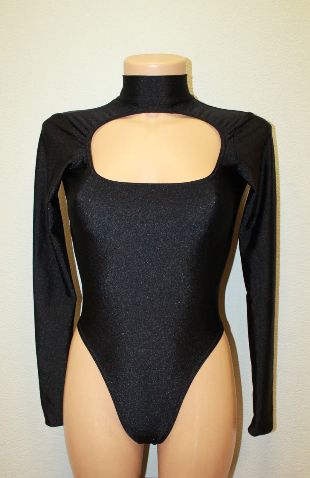 как выглядит Women Thong Leotard 130-07 Long Sleeve High Collar OpenBack Black Spandex Size M фото