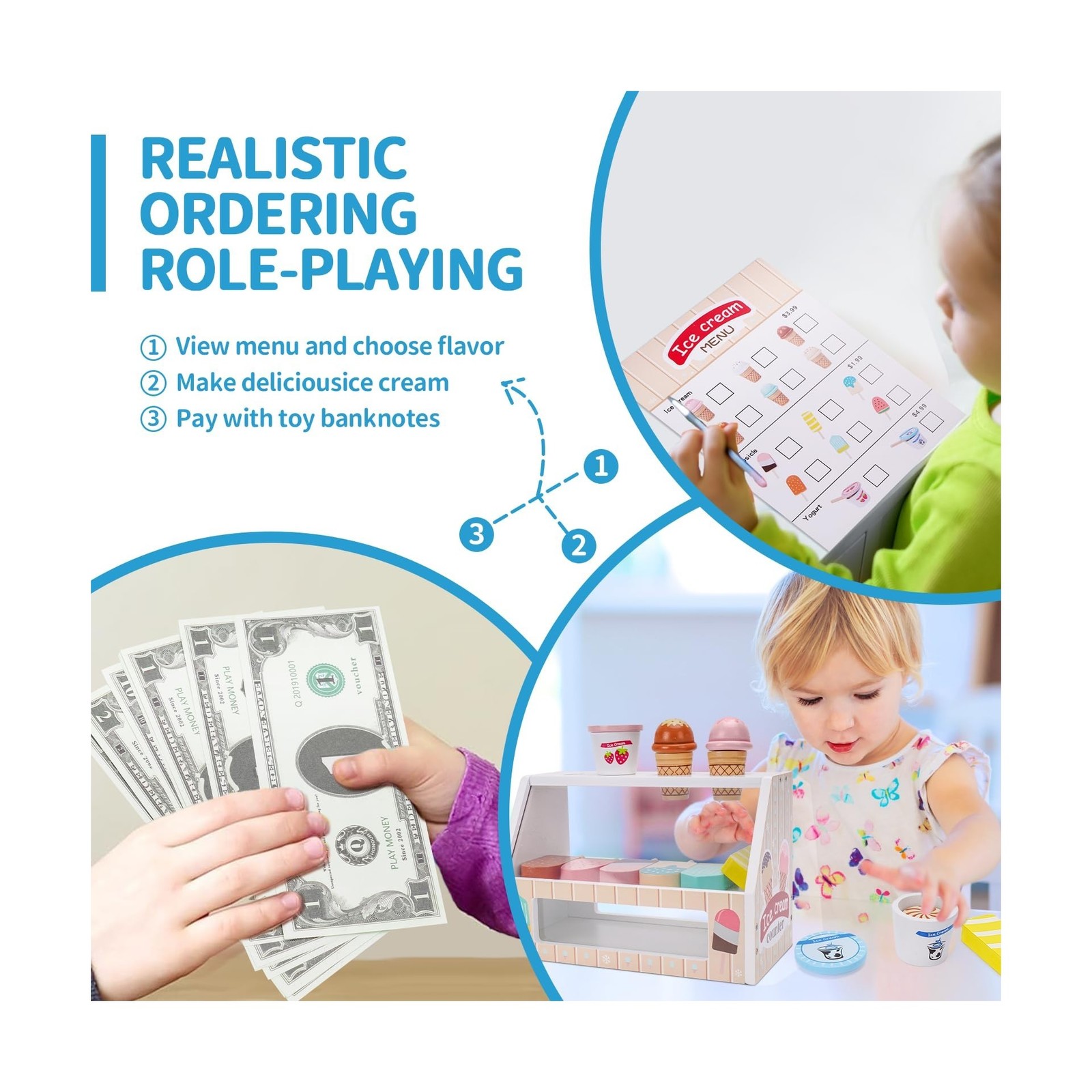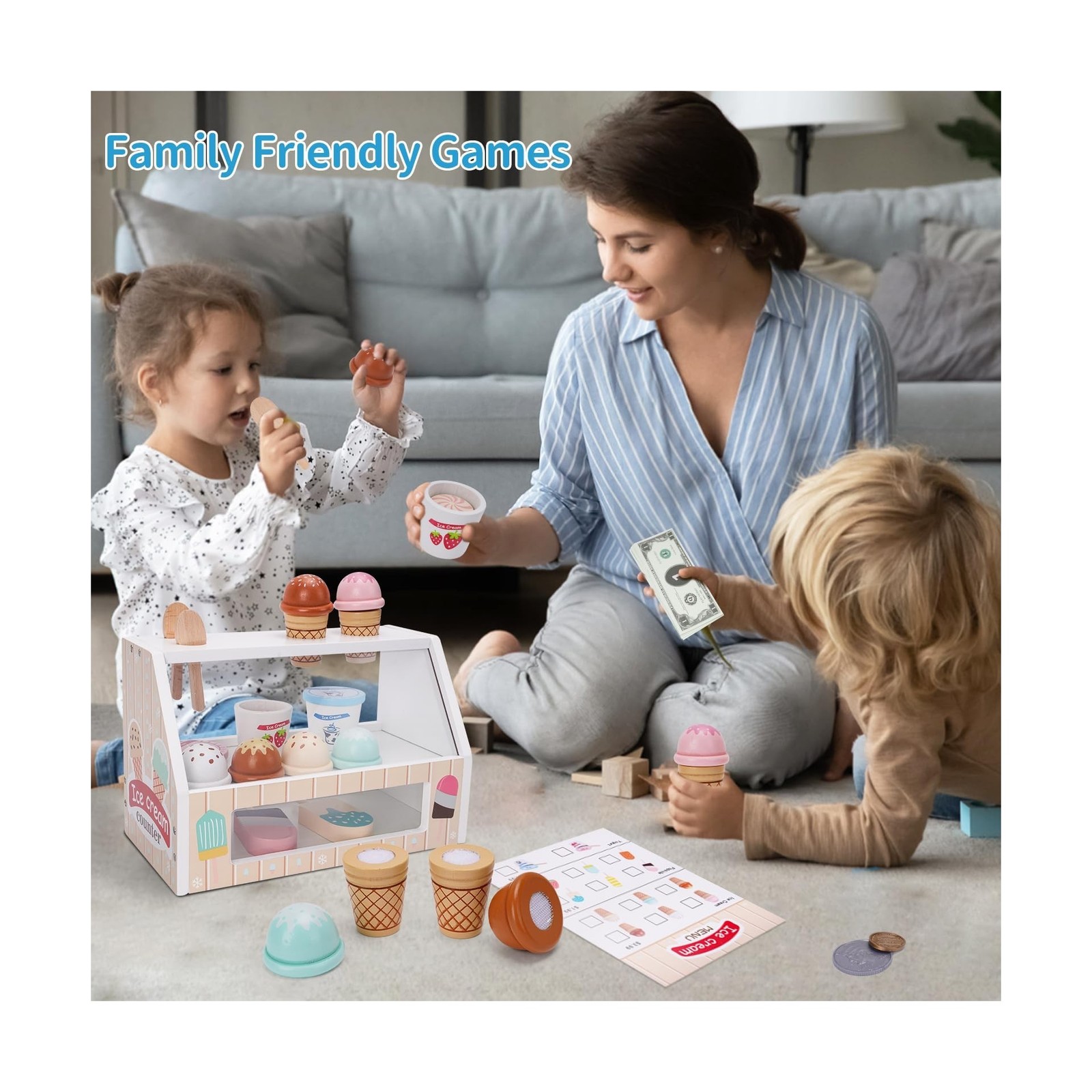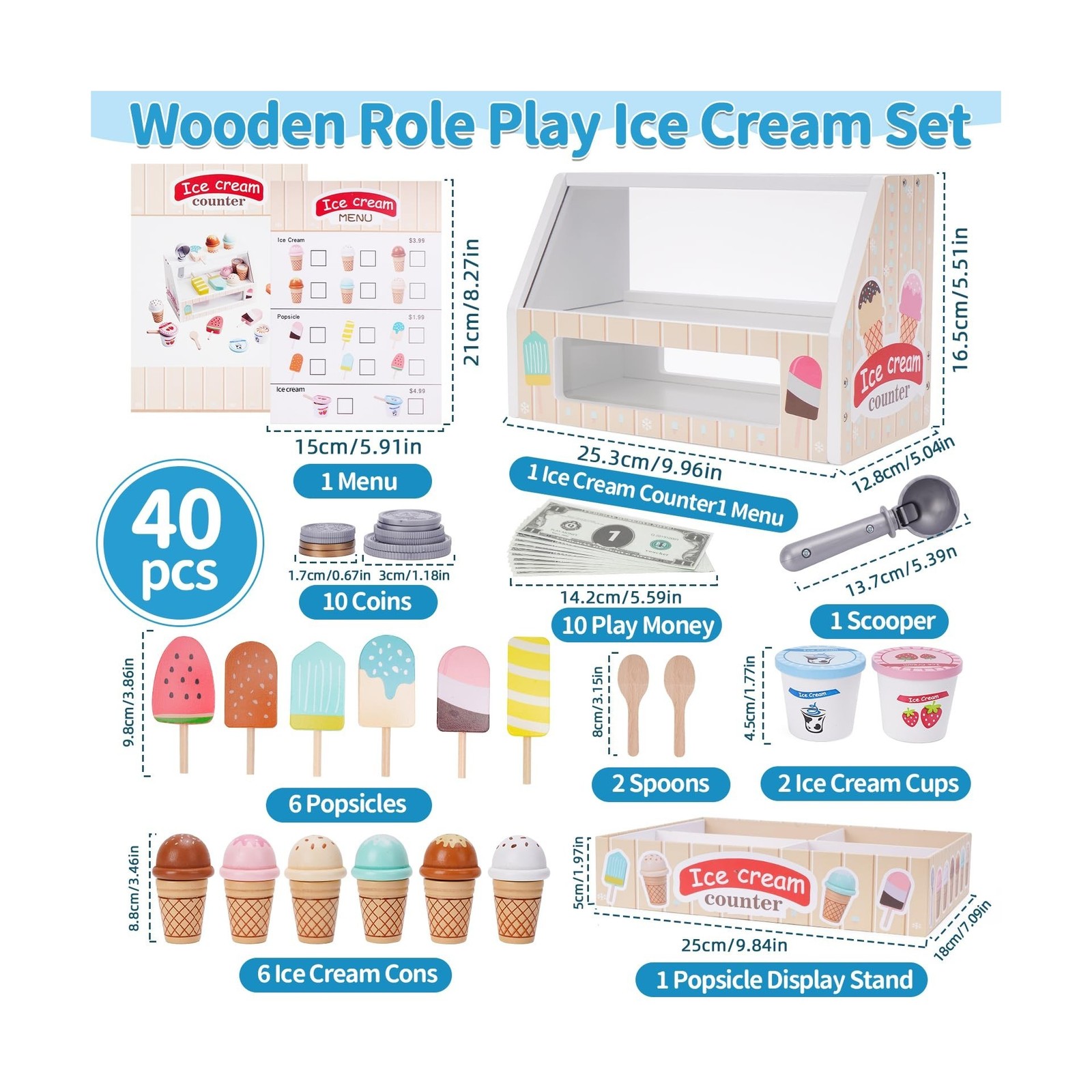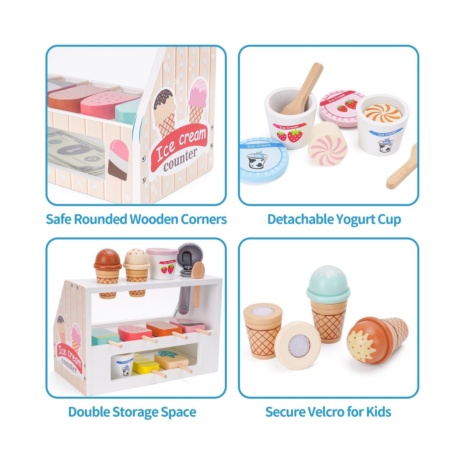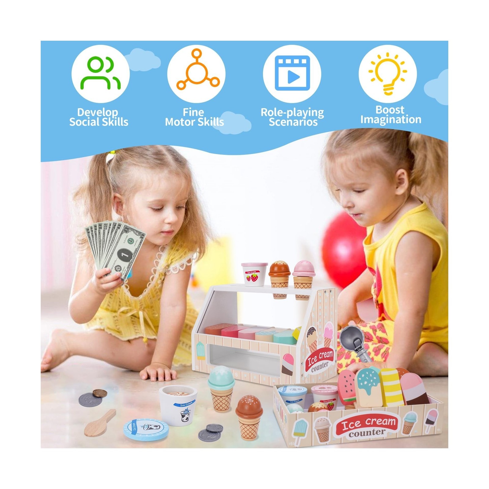 Wooden Ice Cream Counter Playset for Kids, Toddler Girl Toys Kitche... Fast Ship