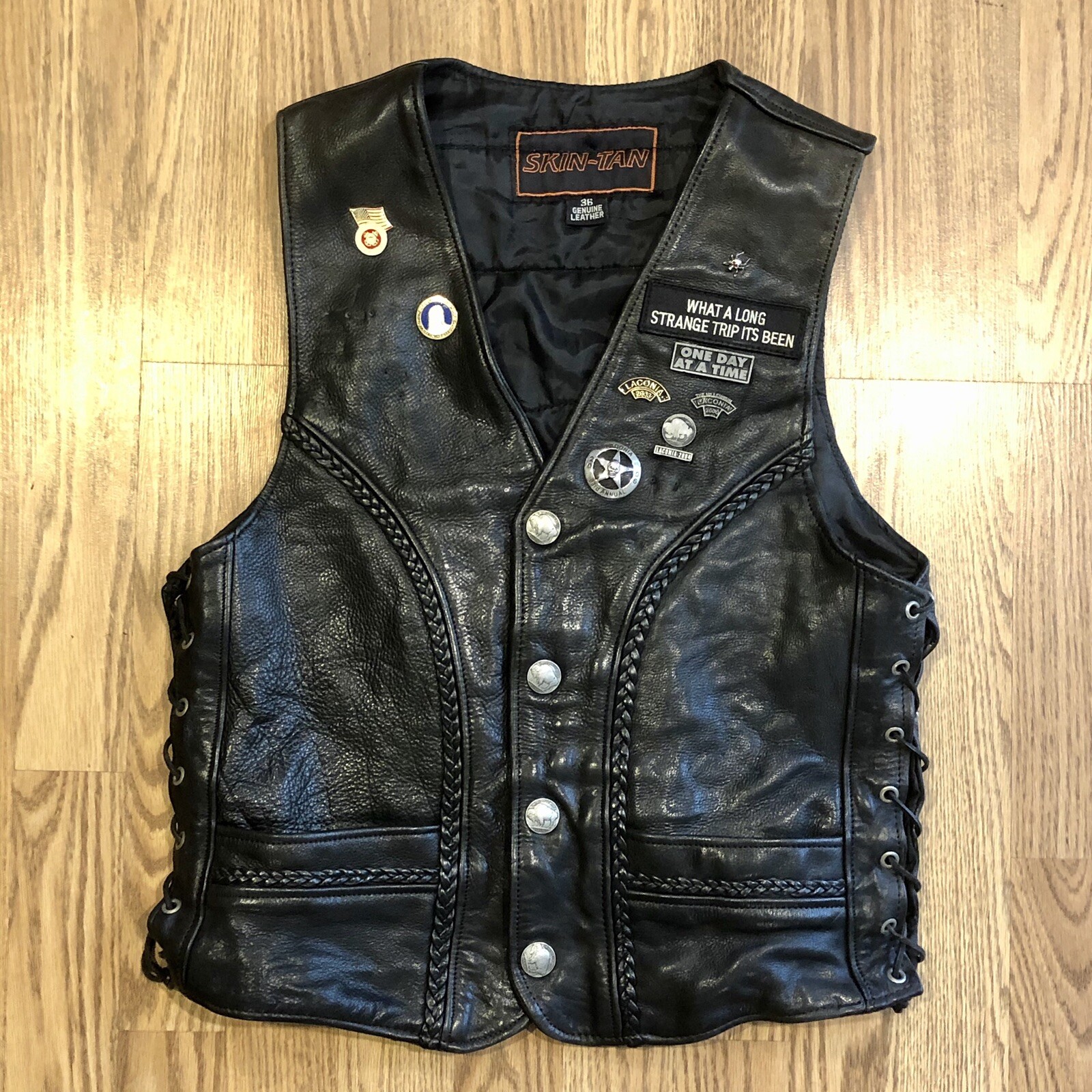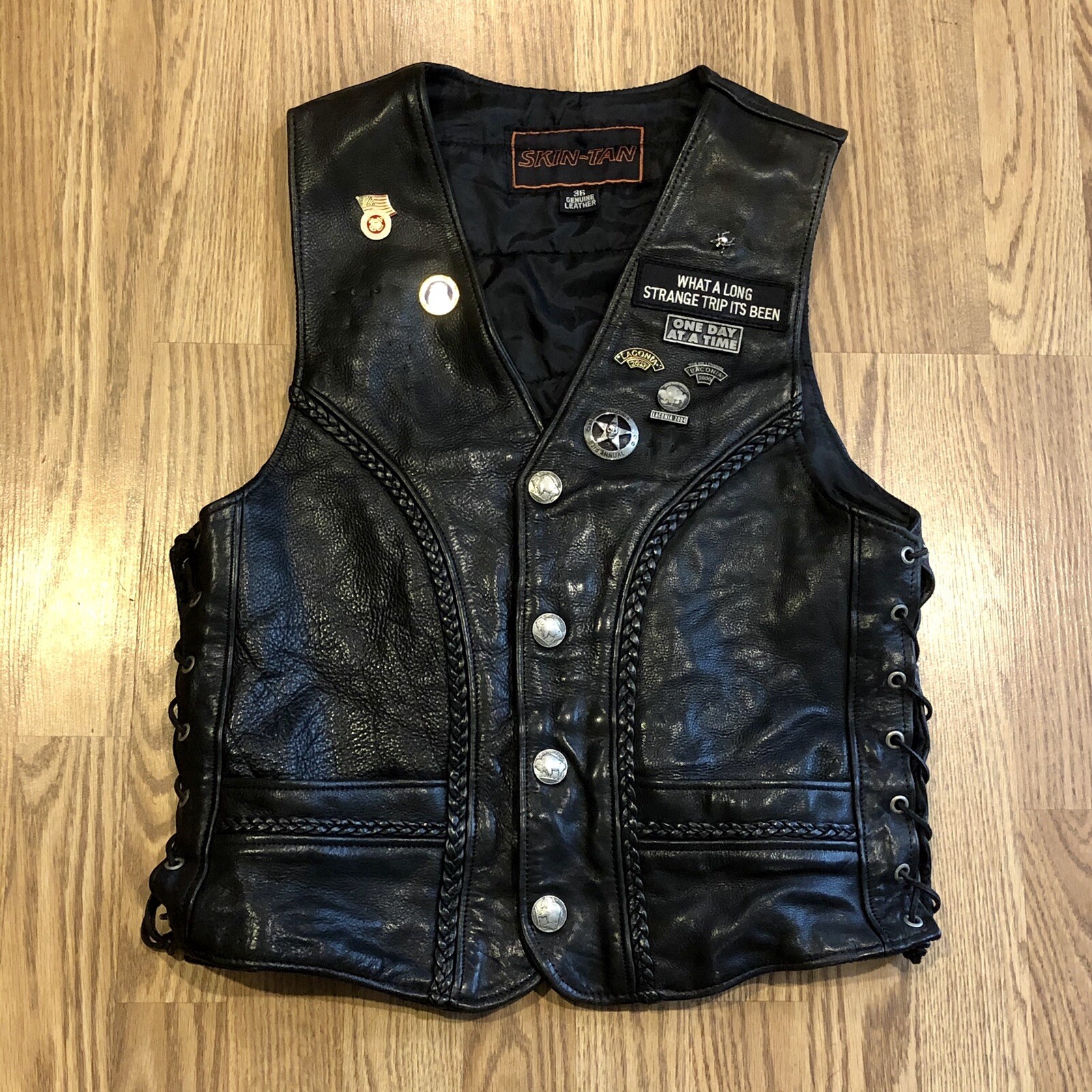 Leather Biker Vest Eagle Patch America First Flag Side Lacde Skin-Tan Size 36