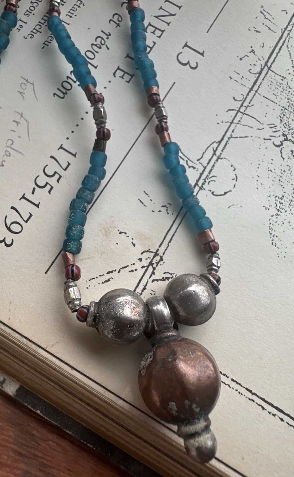 Boho Beaded Necklace Earring Set blue Seed Beads, Tribal Metal Pendant,