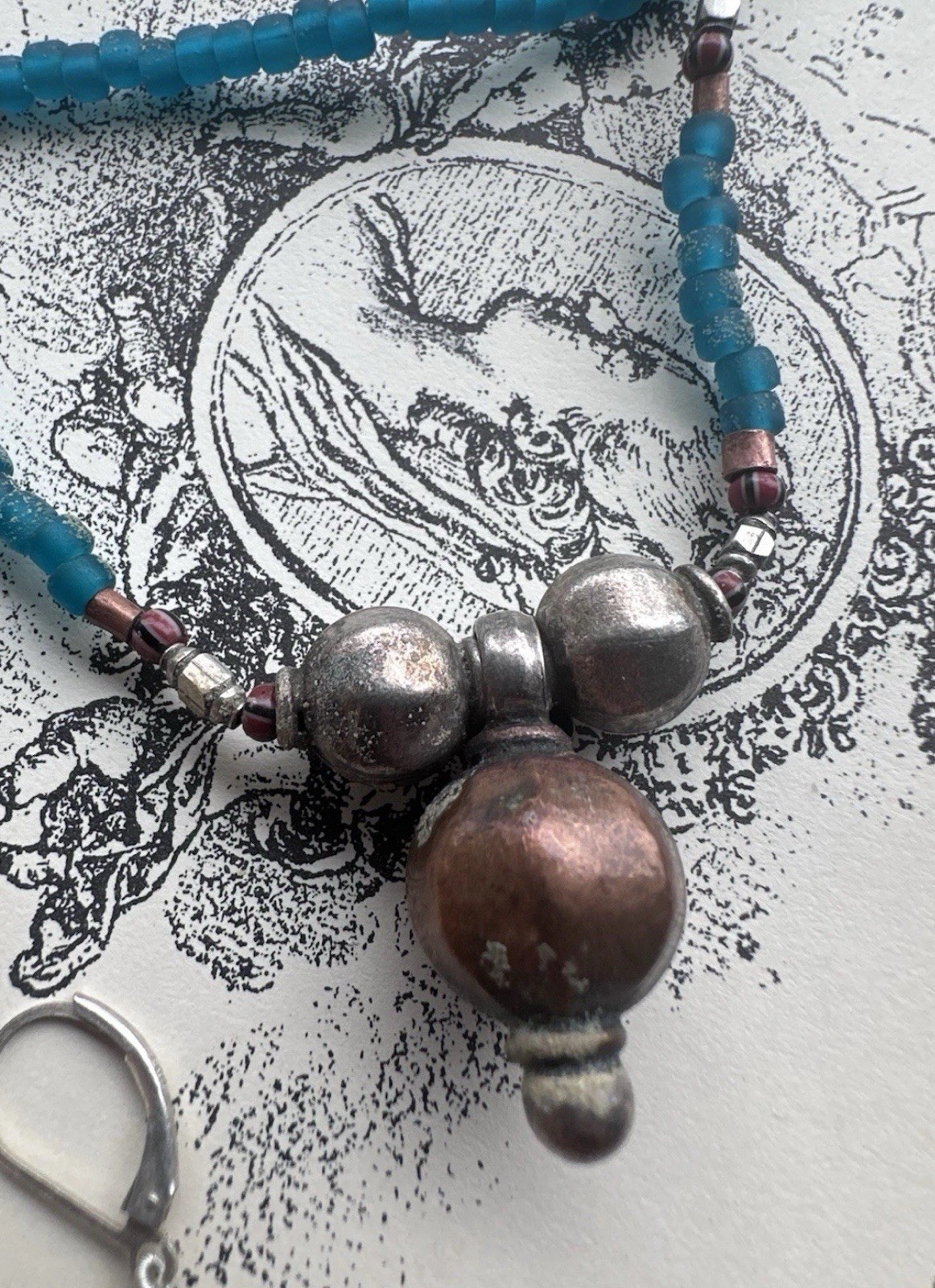 как выглядит Boho Beaded Necklace Earring Set blue Seed Beads, Tribal Metal Pendant, фото