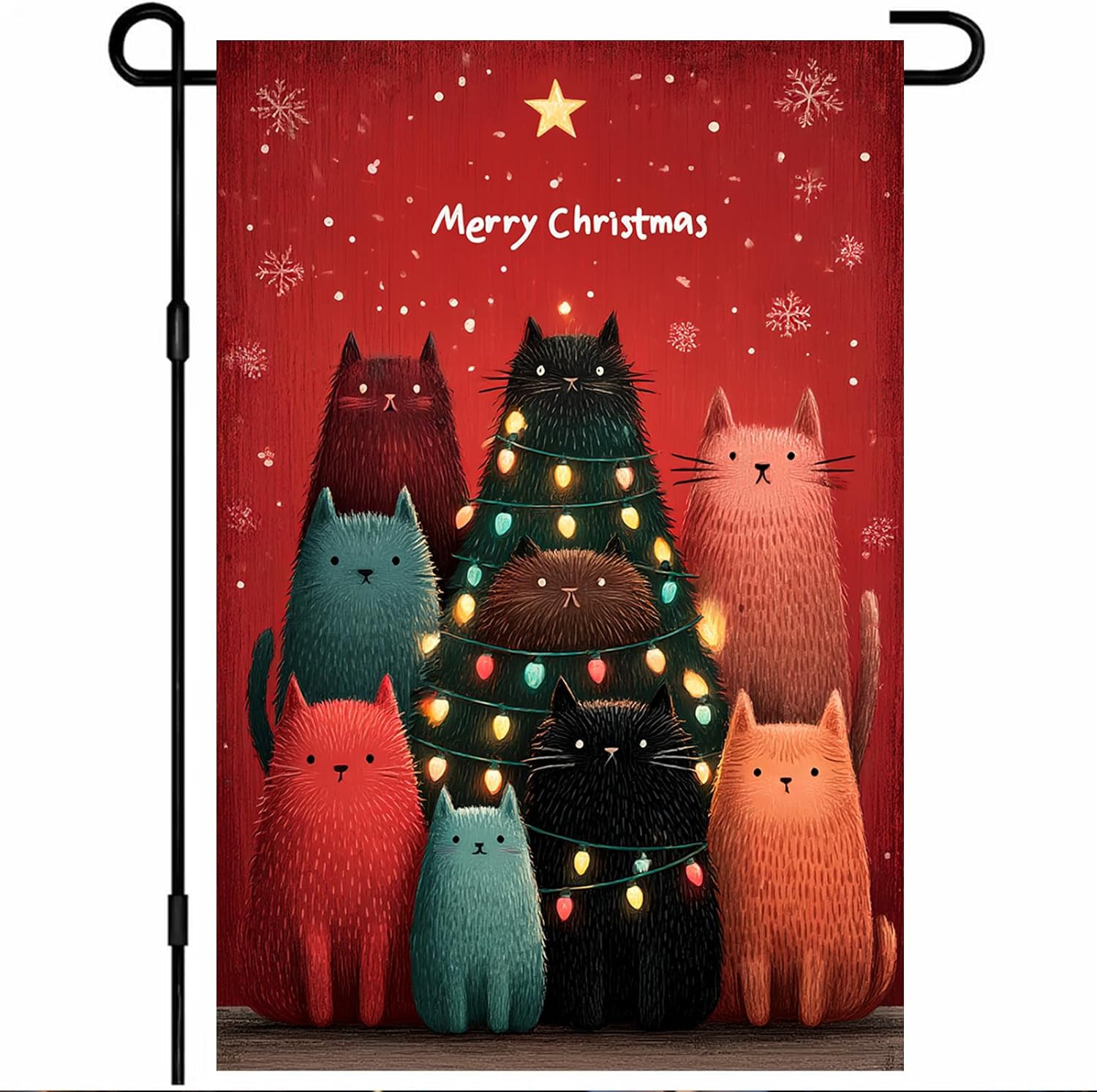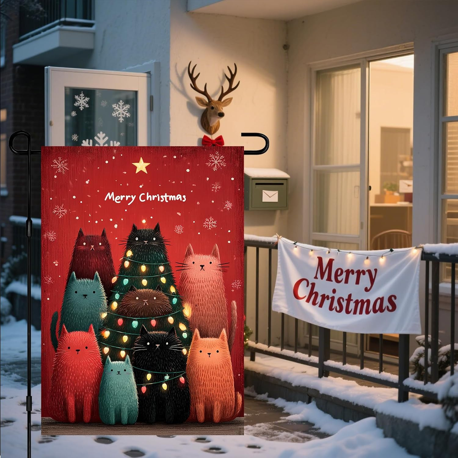Christmas Cat Garden Flag 12X18 Inch Funny Holiday Tree Lights Yard Banner for O