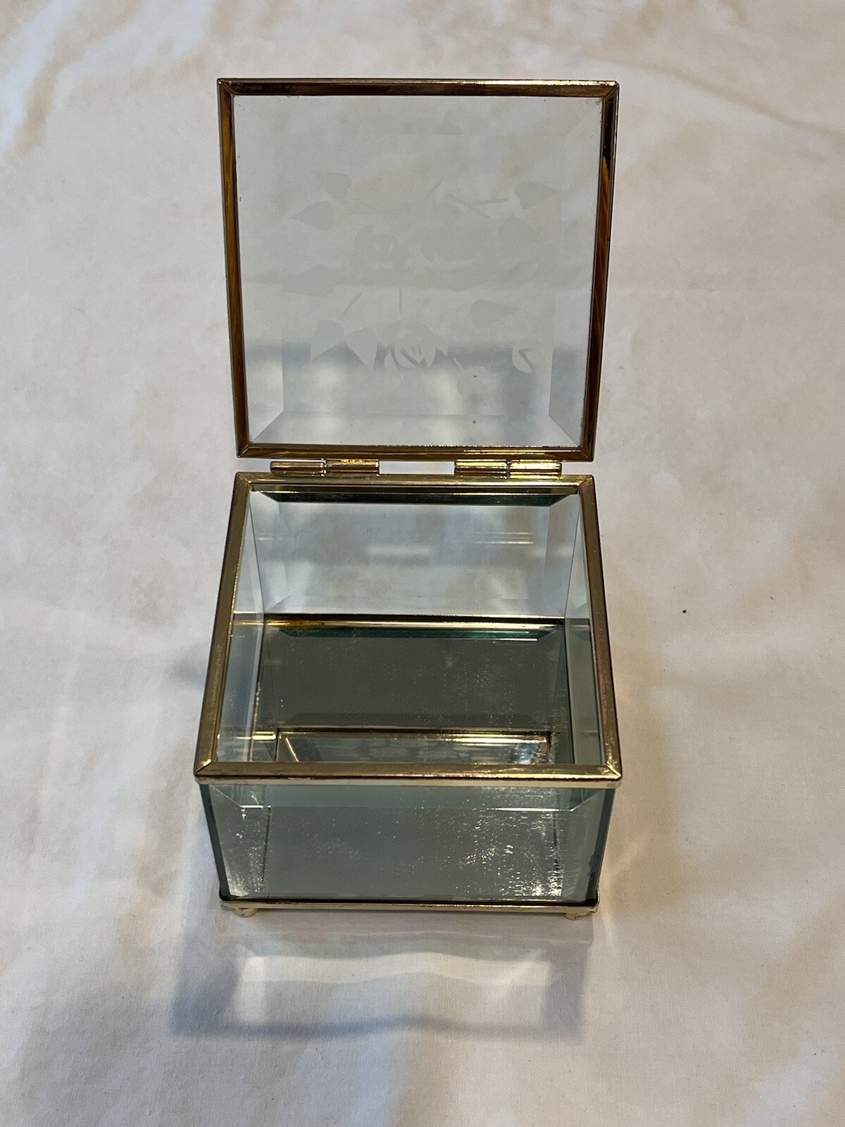 Vintage Square Beveled Glass Mirrored Brass Frosted Flowers Jewelry Box Curio