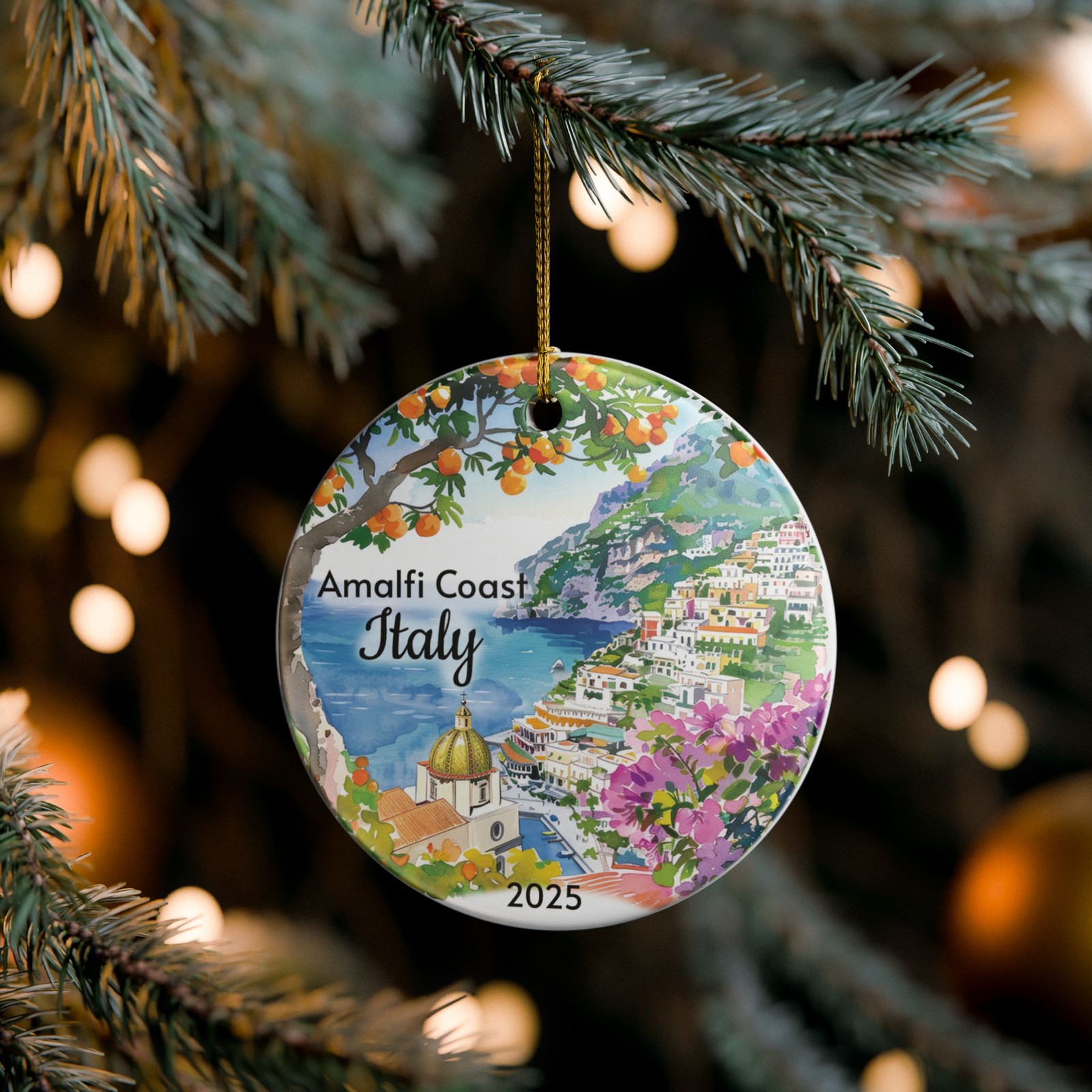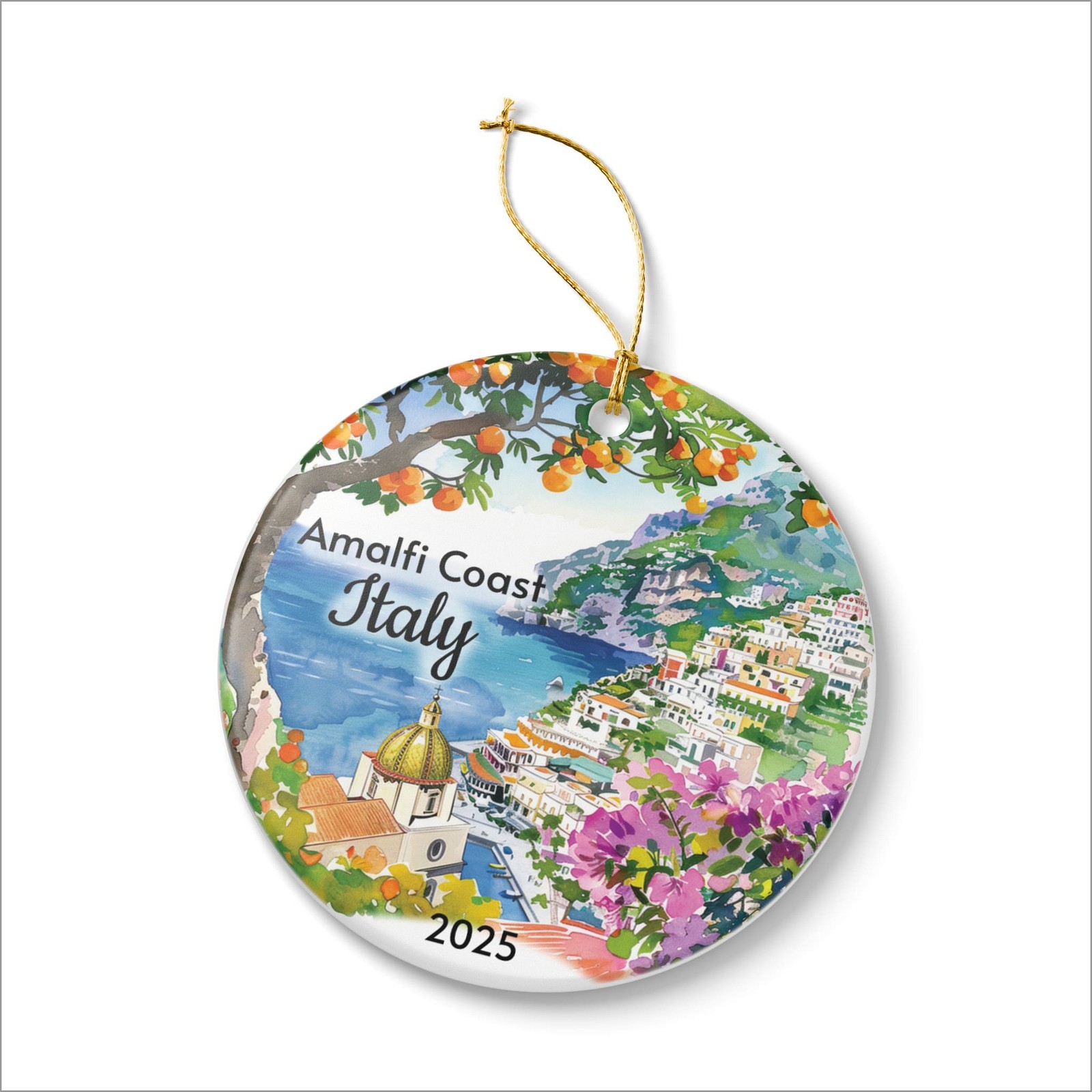 Amalfi Coast ceramic ornament, cliffside village and dome, custom year