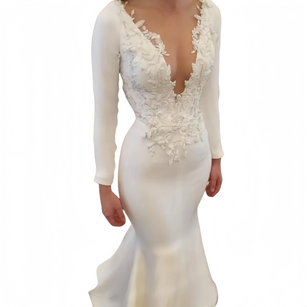 как выглядит Elegant Mermaid Wedding Dresses Transparent Deep V Neck Full Sleeve Satin Gowns фото