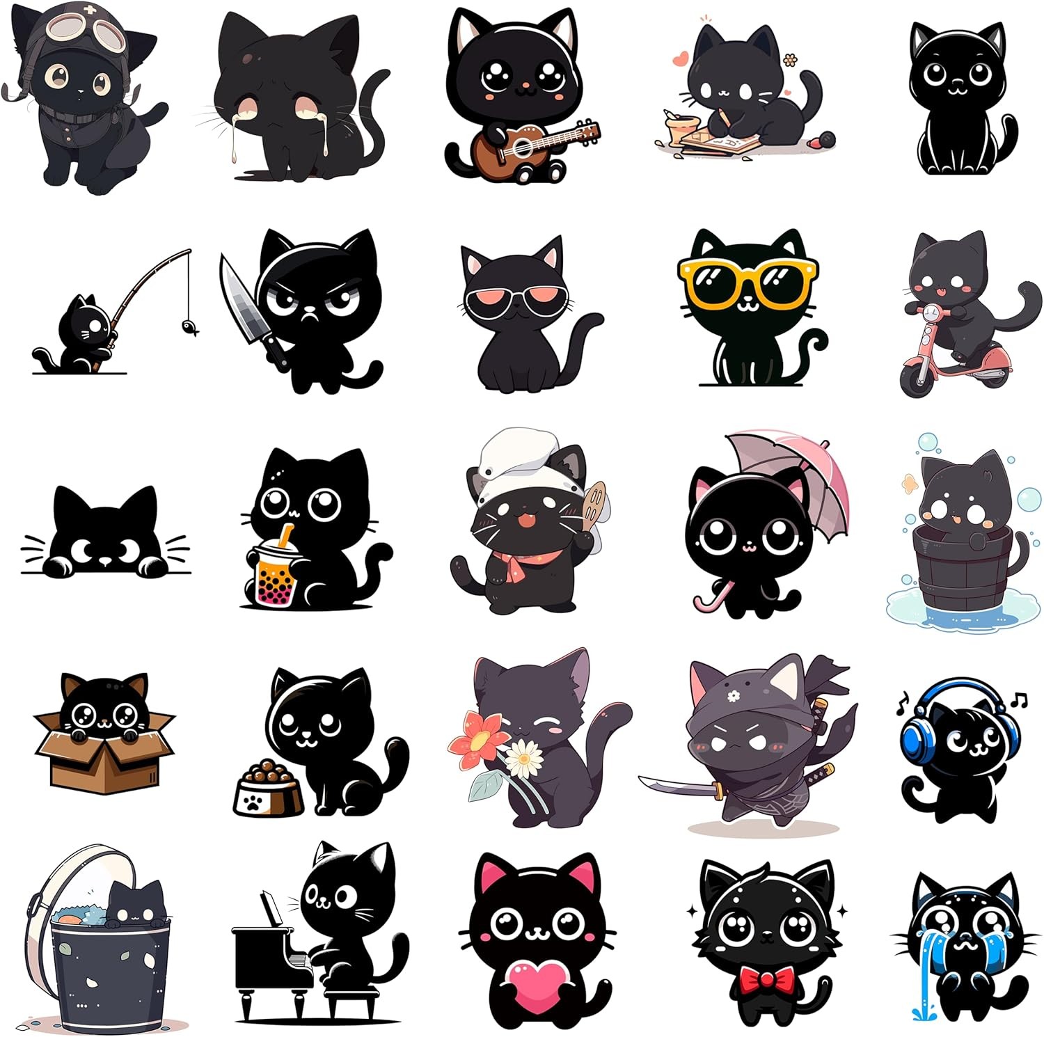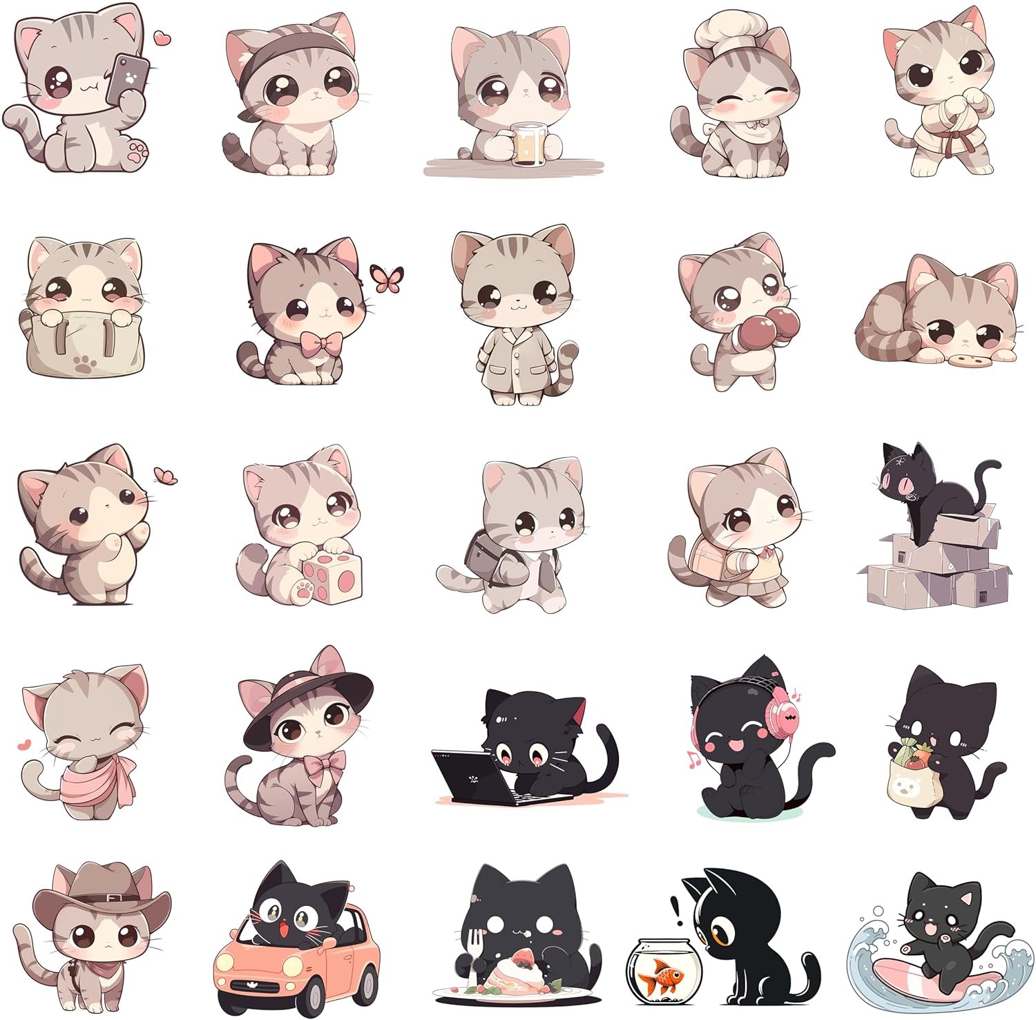 50PCS Cute Cat Stickers for Kids Girls Teen Adults, Kawaii Kitten Grey/Black