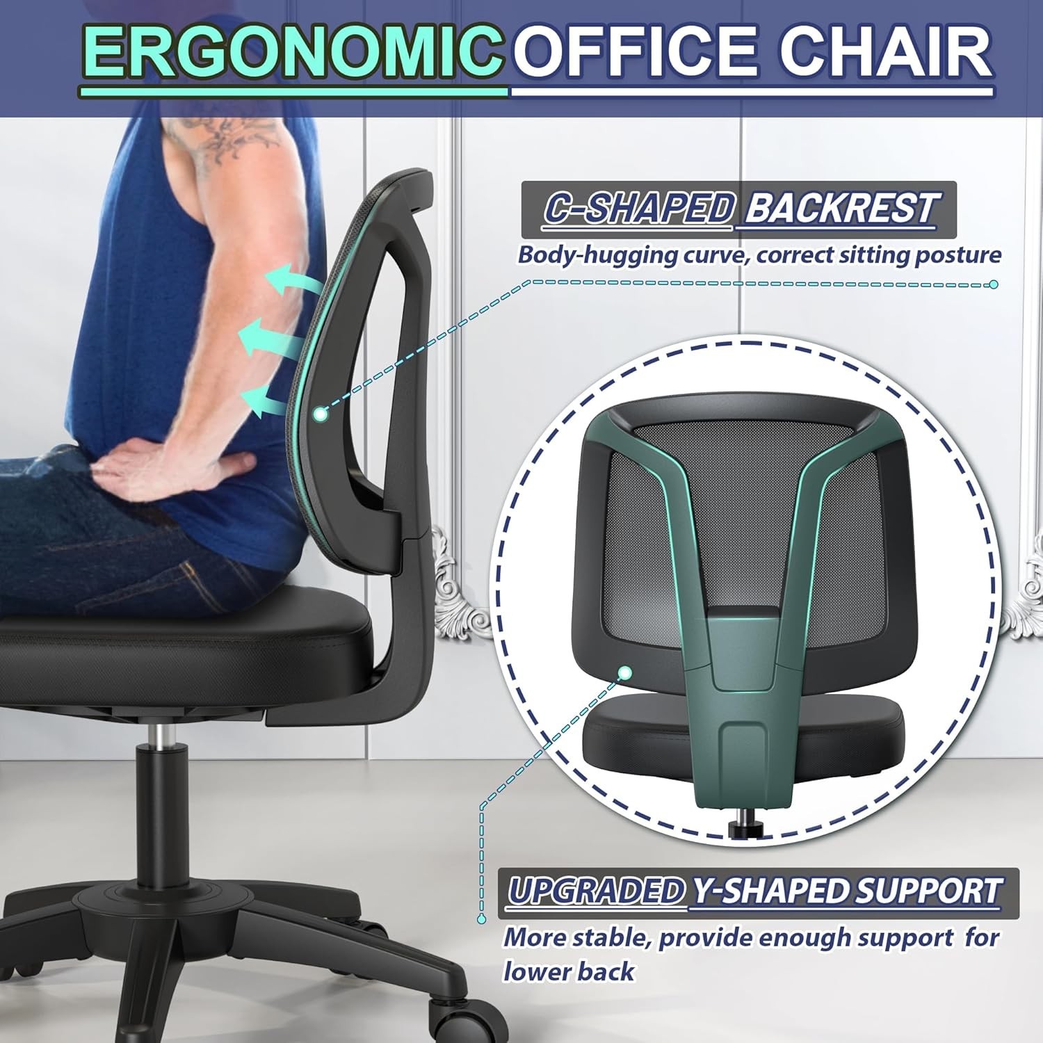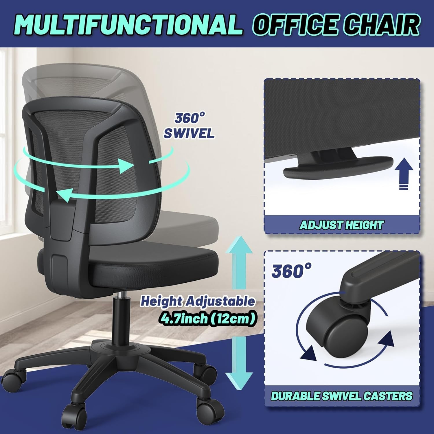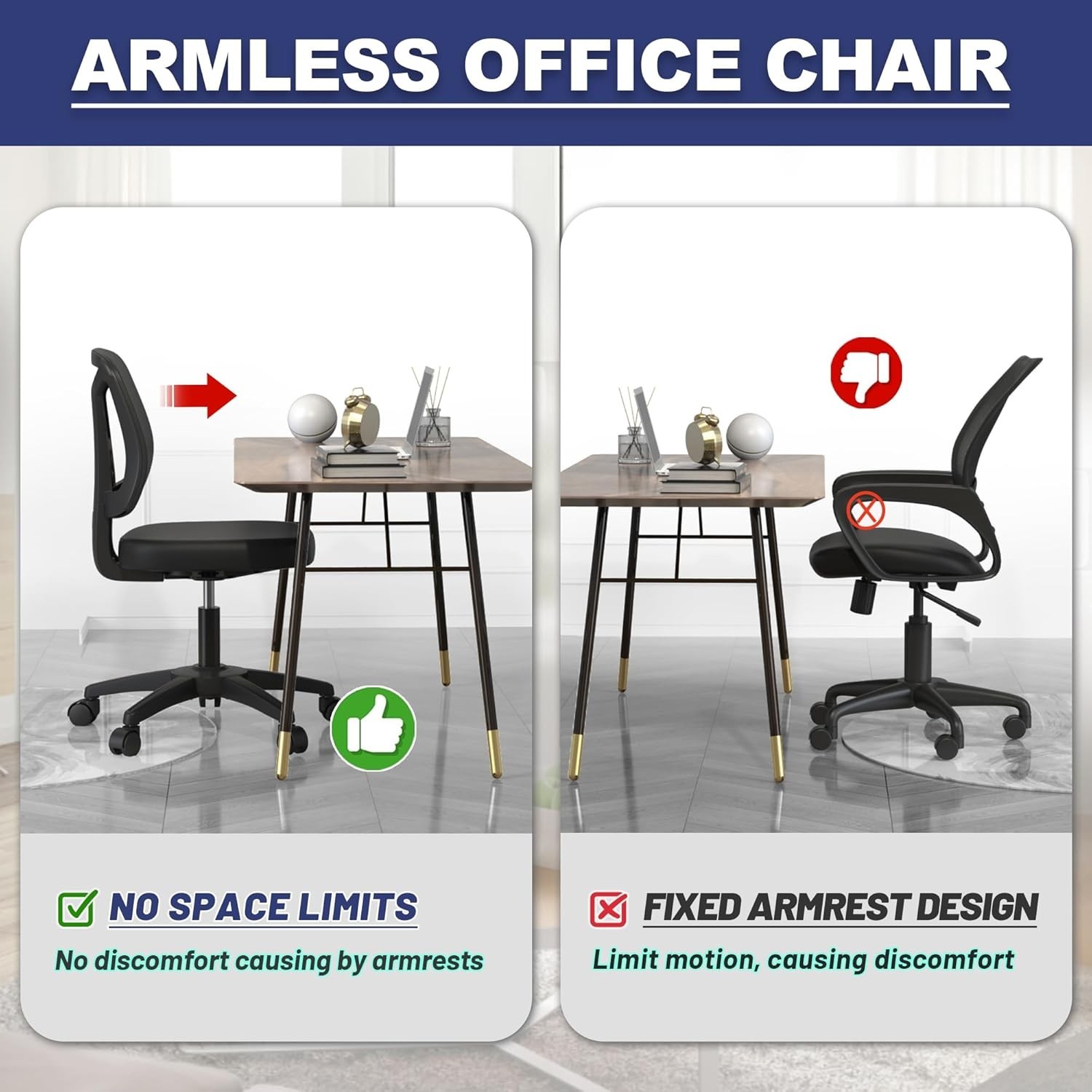 Armless Office Desk Chair No Arms with Back Support Rolling Wheels