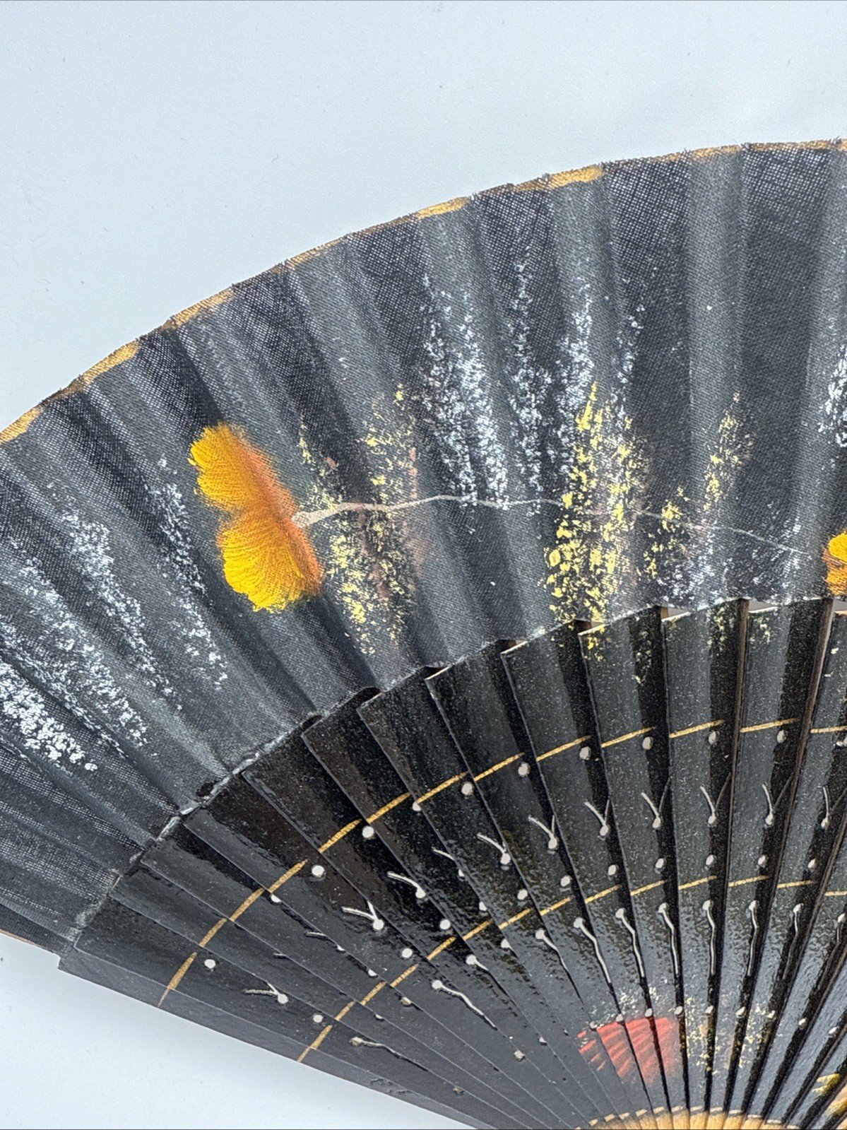 Vintage Black Pleated Folding Fan - Painted Floral Fabric - Spain