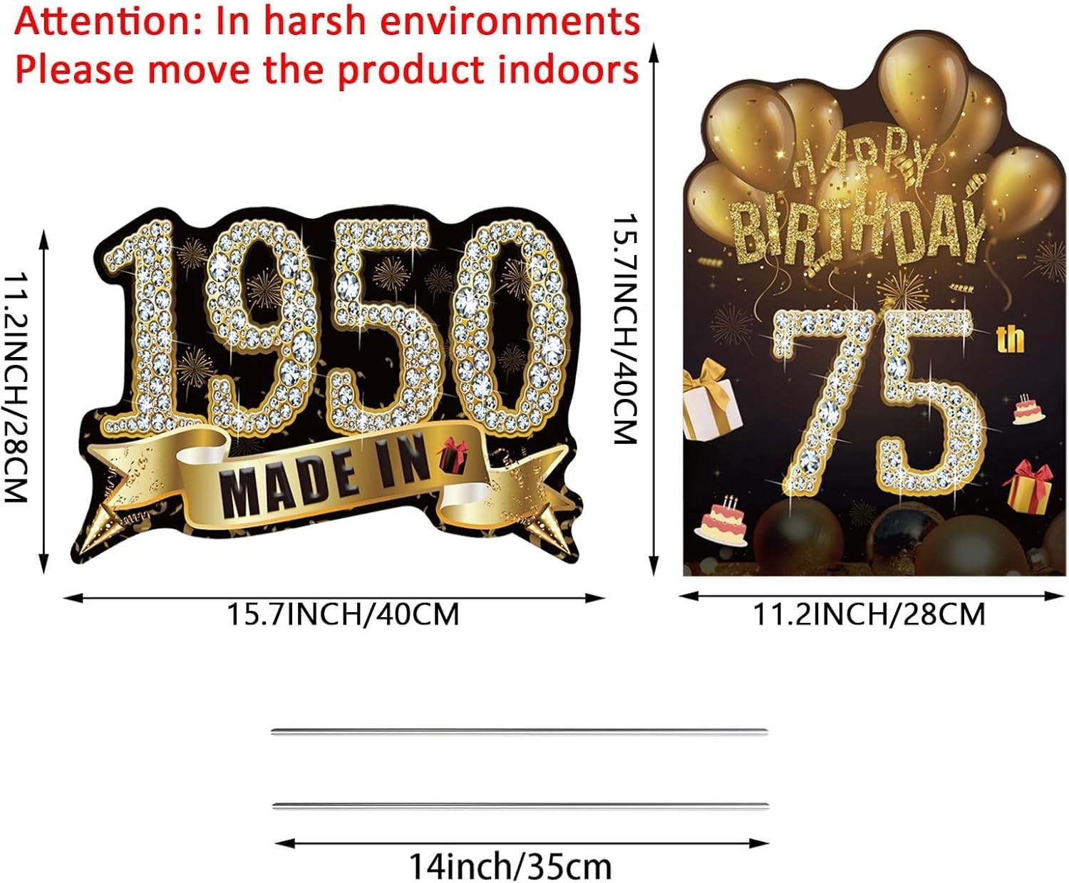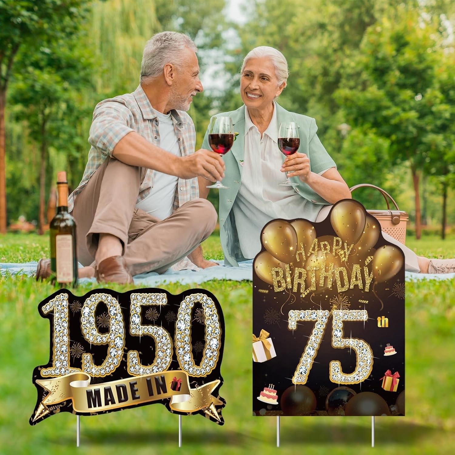 как выглядит 2Pcs Black Gold 75th Birthday Yard Sign Decoration for Men Women, Happy 75th ... фото