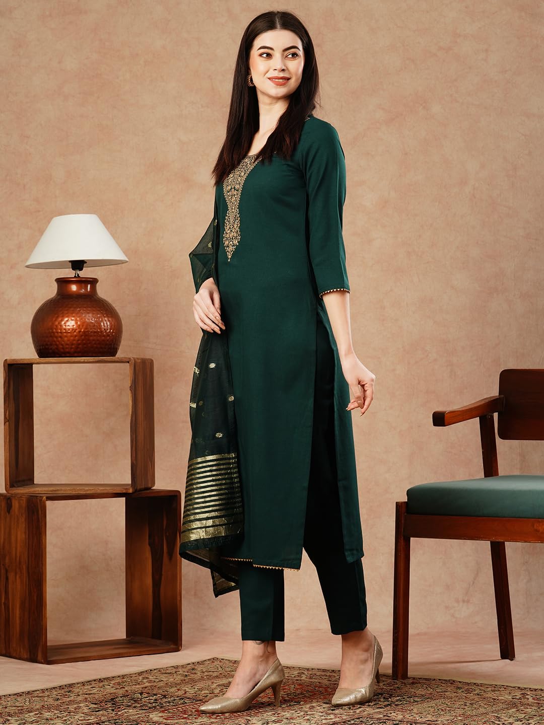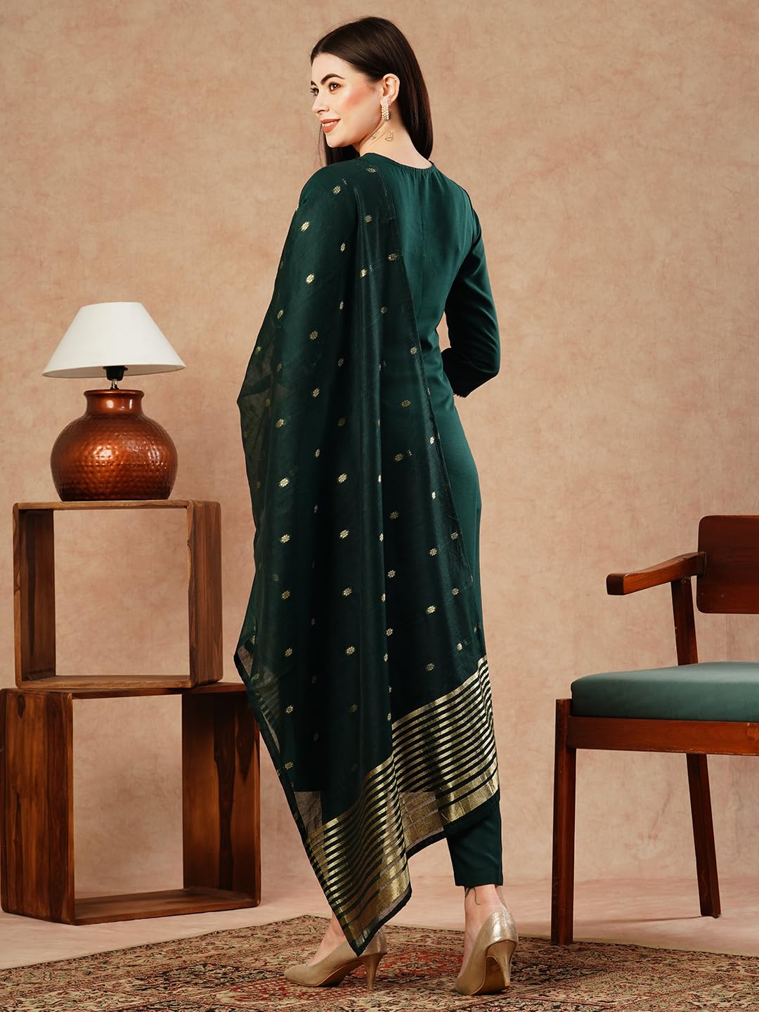 GoSriKi Women's Cotton Blend Straight Embroidered Kurta with Pant Dupatta