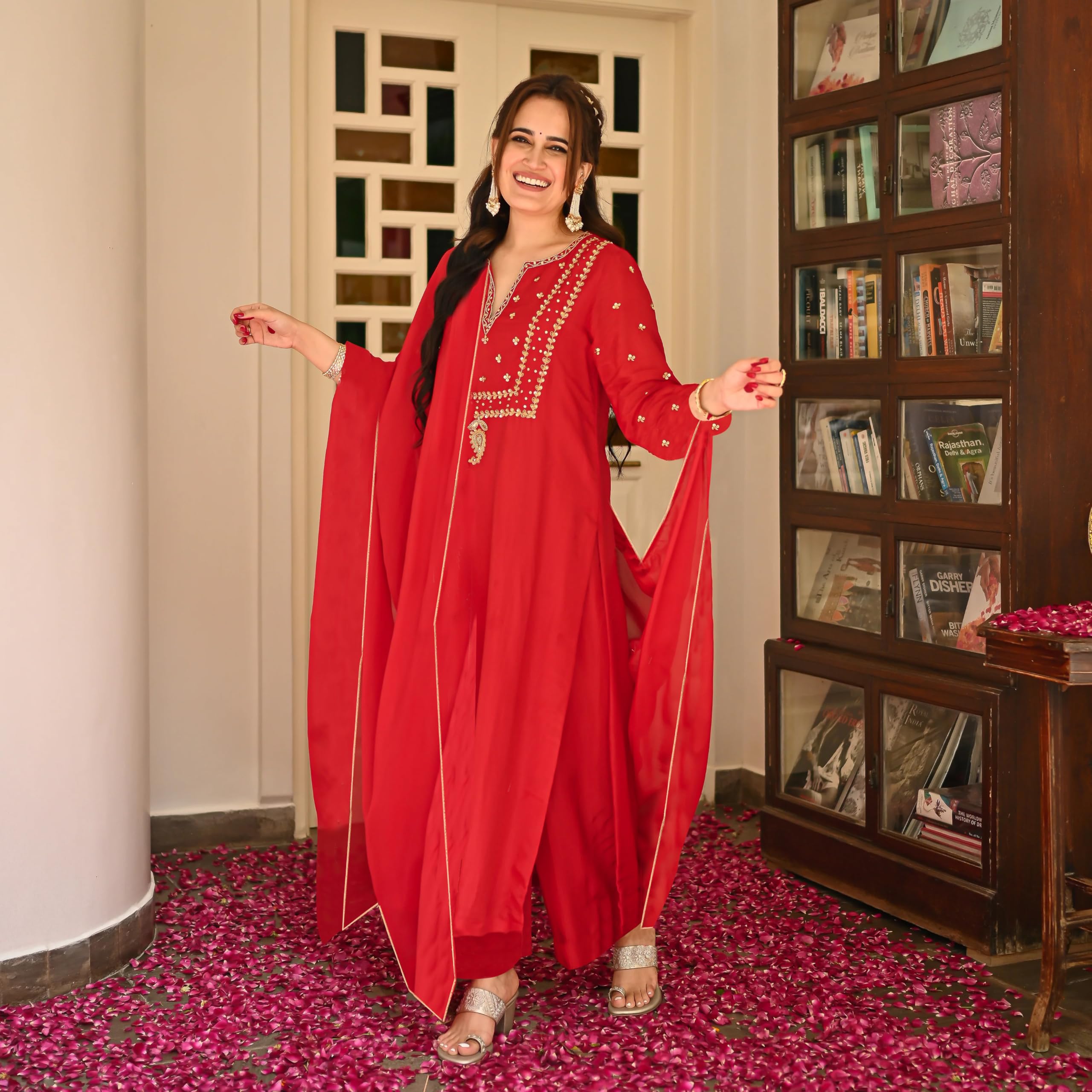 GoSriKi Women's Rayon Blend Straight Embroidered Kurta with Pant Dupatta