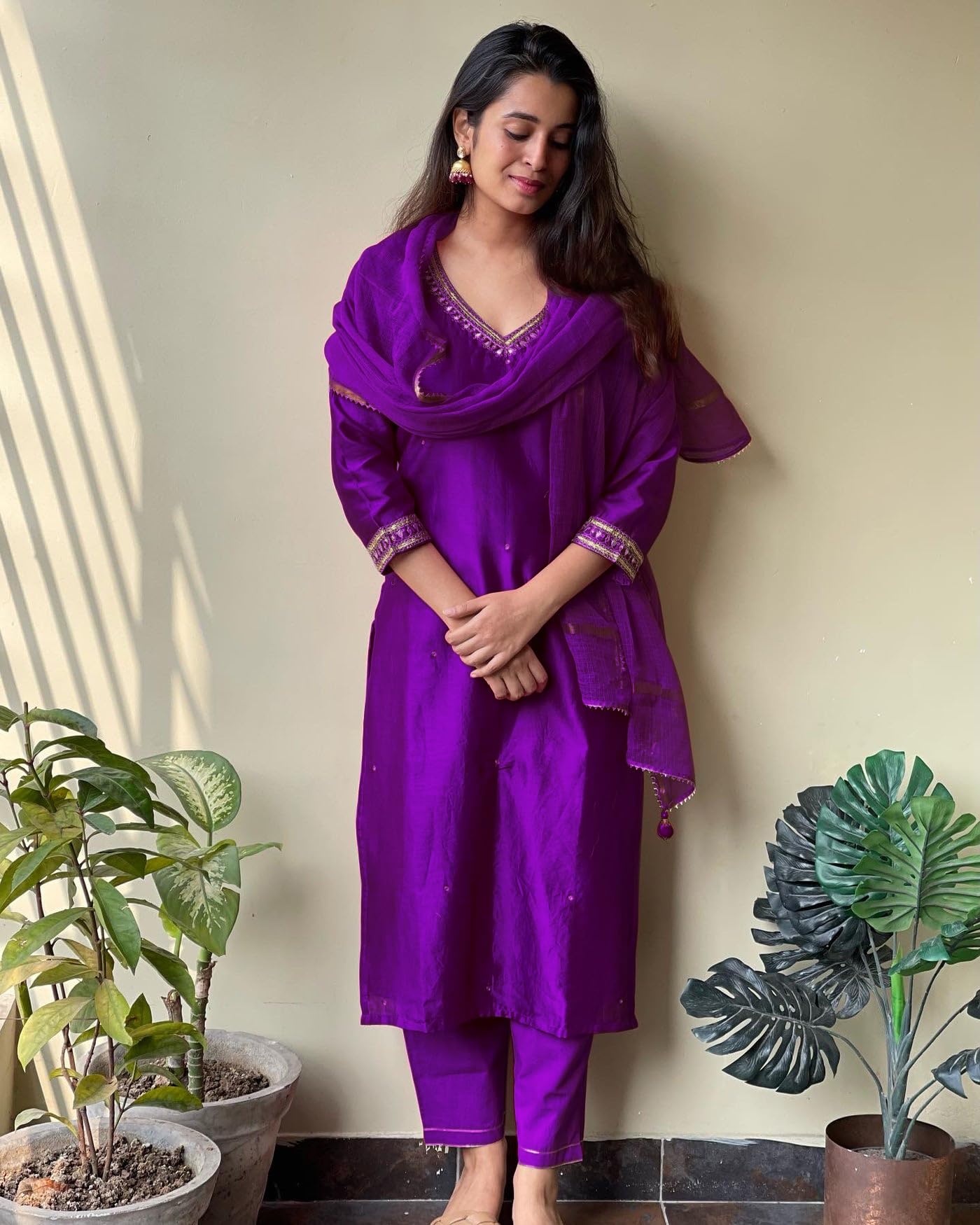 GoSriKi Women's Cotton Blend Straight Embroidered Kurta with Pant Dupatta