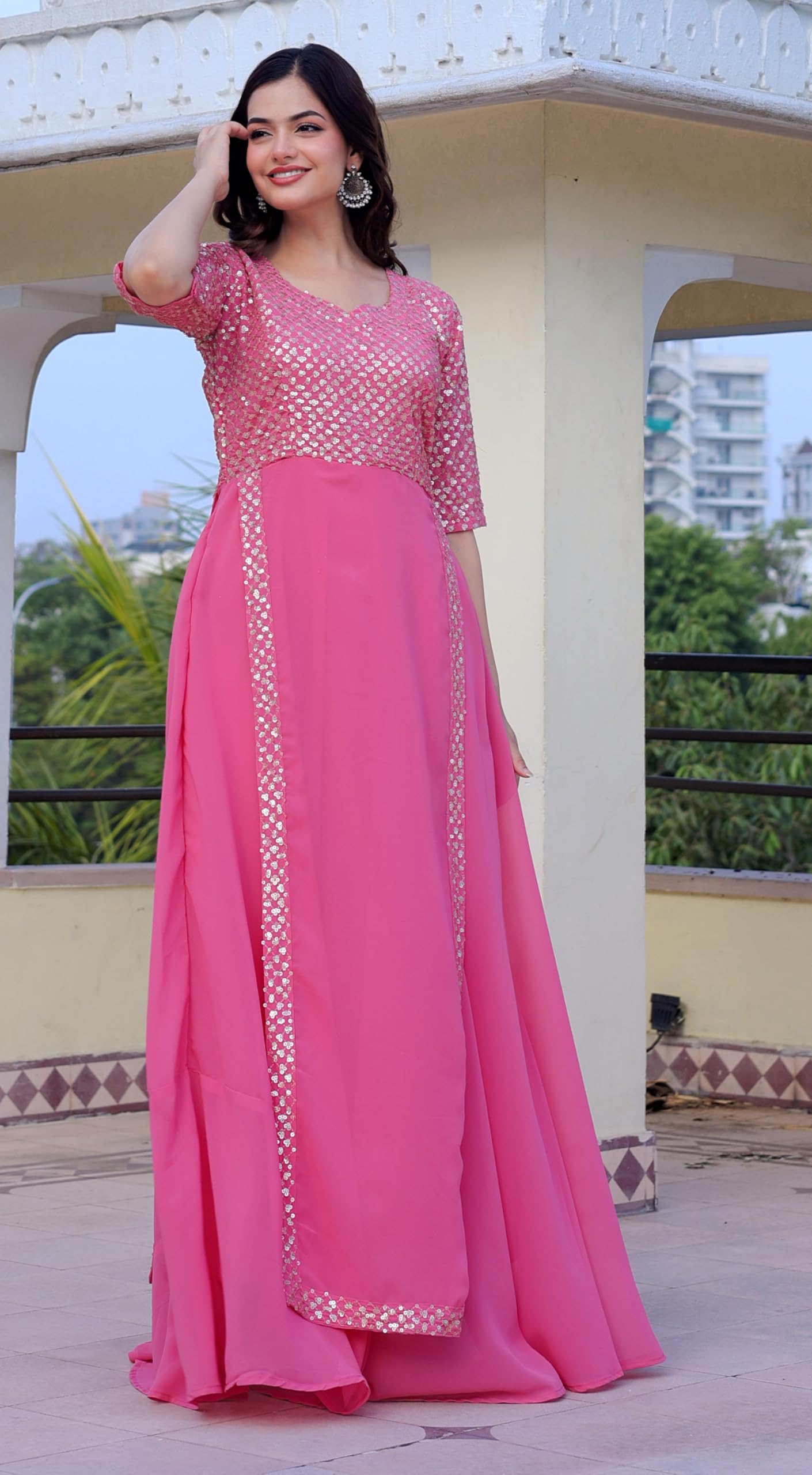 как выглядит Wedani Faux Georgette Embroidery Sequins Work Anarkali Kurta Set for Women фото