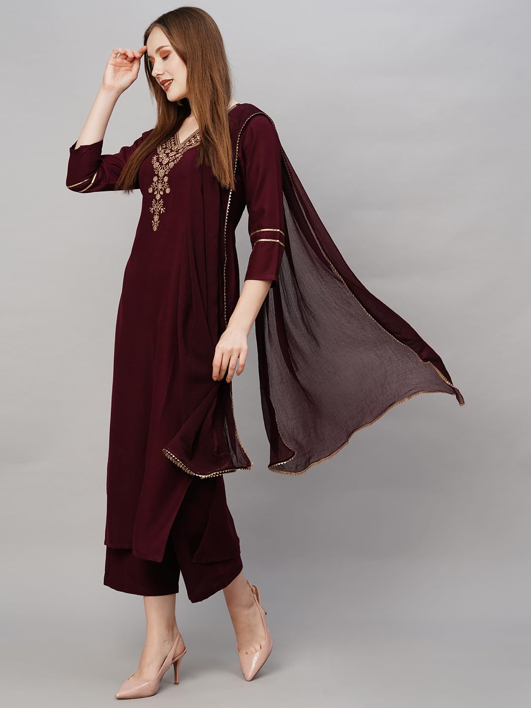 GoSriKi Women's Cotton Blend Straight Embroidered Kurta with Pant Dupatta