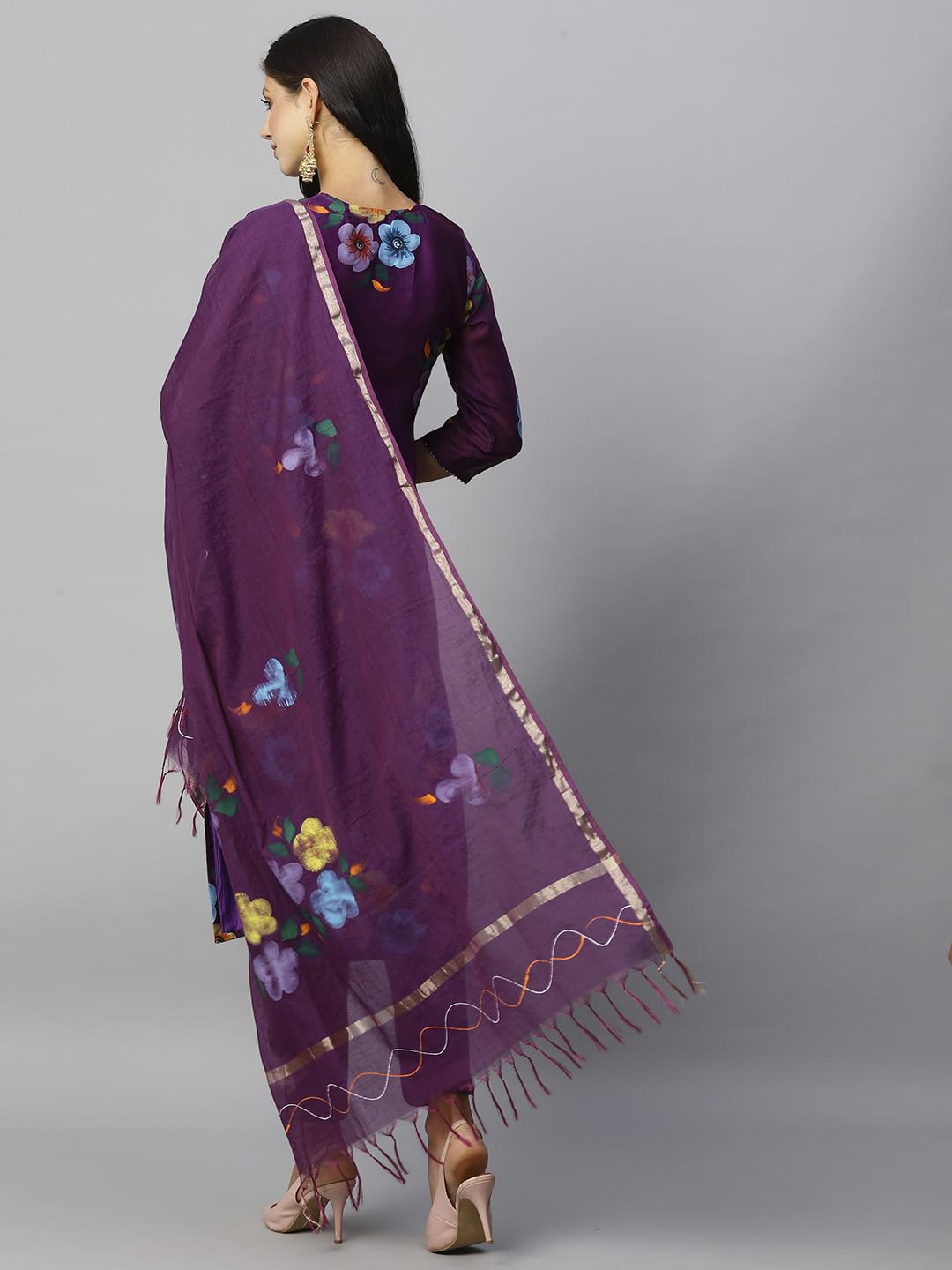 как выглядит GoSriKi Womens Chanderi Cotton Straight Printed Kurta with Pant Dupatta фото