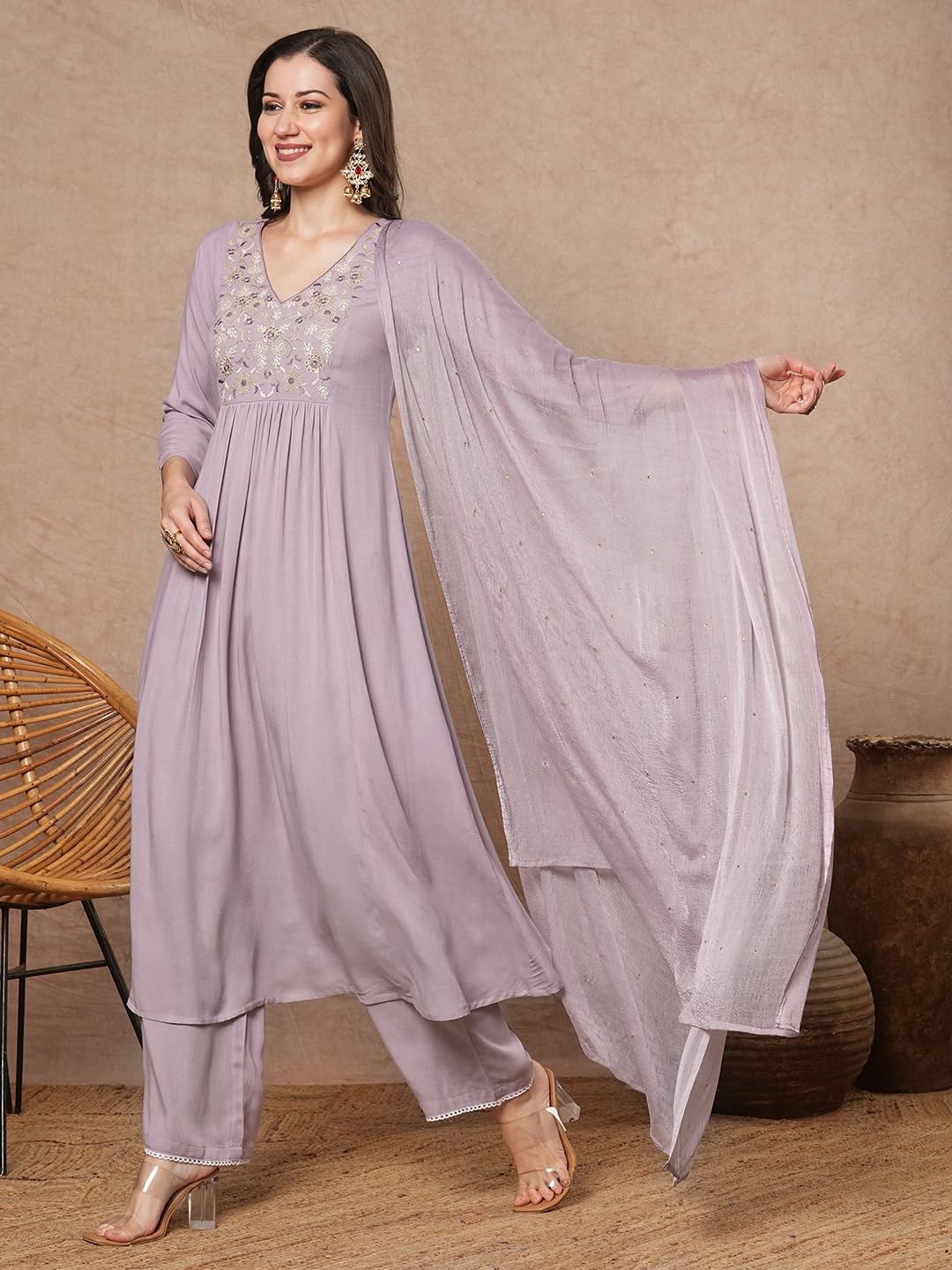 как выглядит GoSriKi Womens Rayon Blend A-Line Embroidered Kurta with Pant Dupatta фото