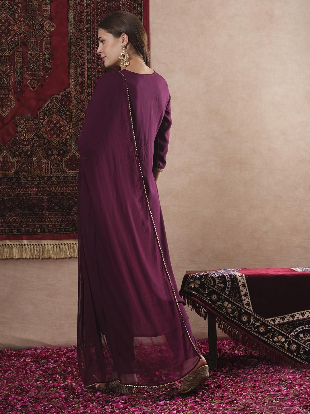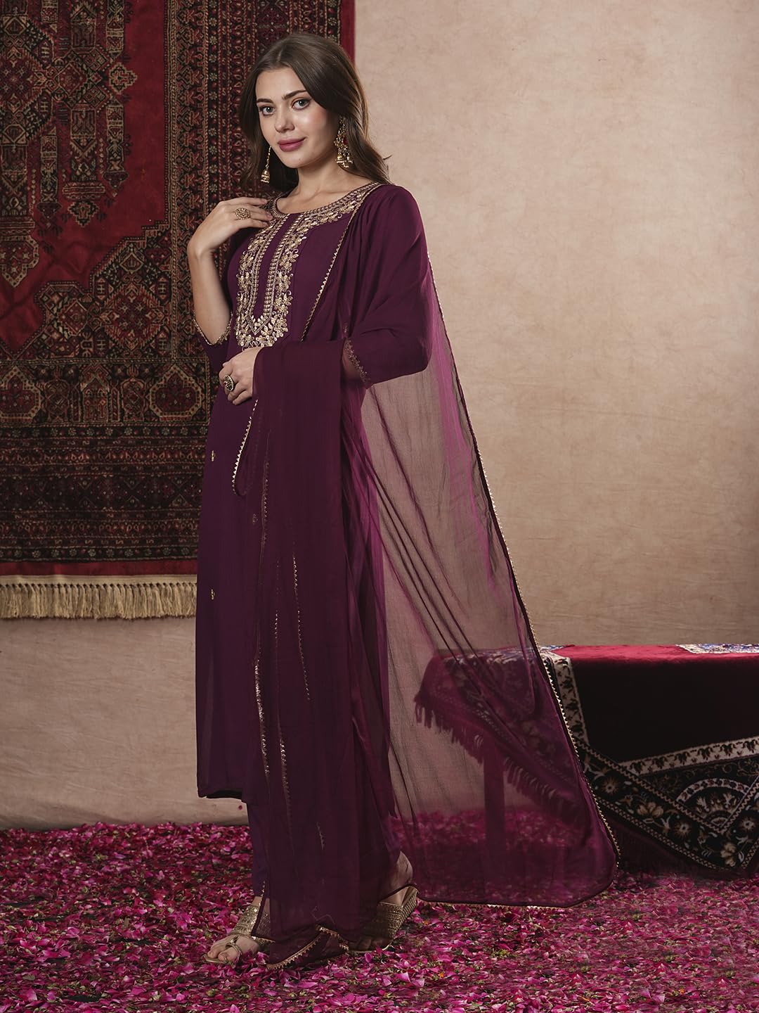 GoSriKi Women's Cotton Blend Straight Embroidered Kurta with Pant Dupatta