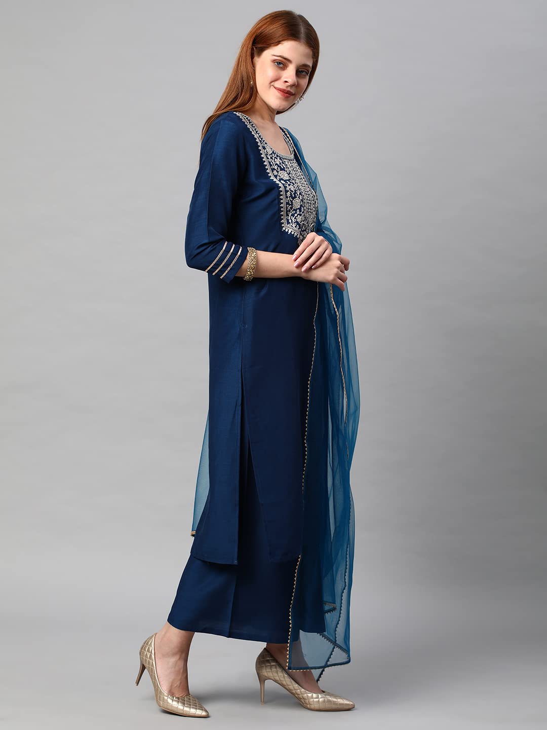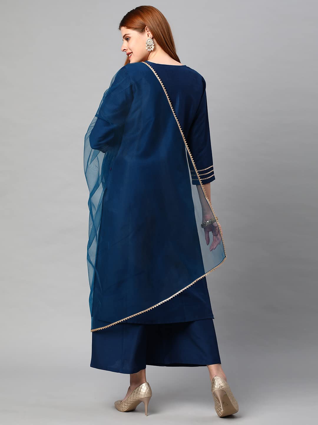 GoSriKi Women's Cotton Blend Solid Straight Kurta with Palazzos Dupatta DH...