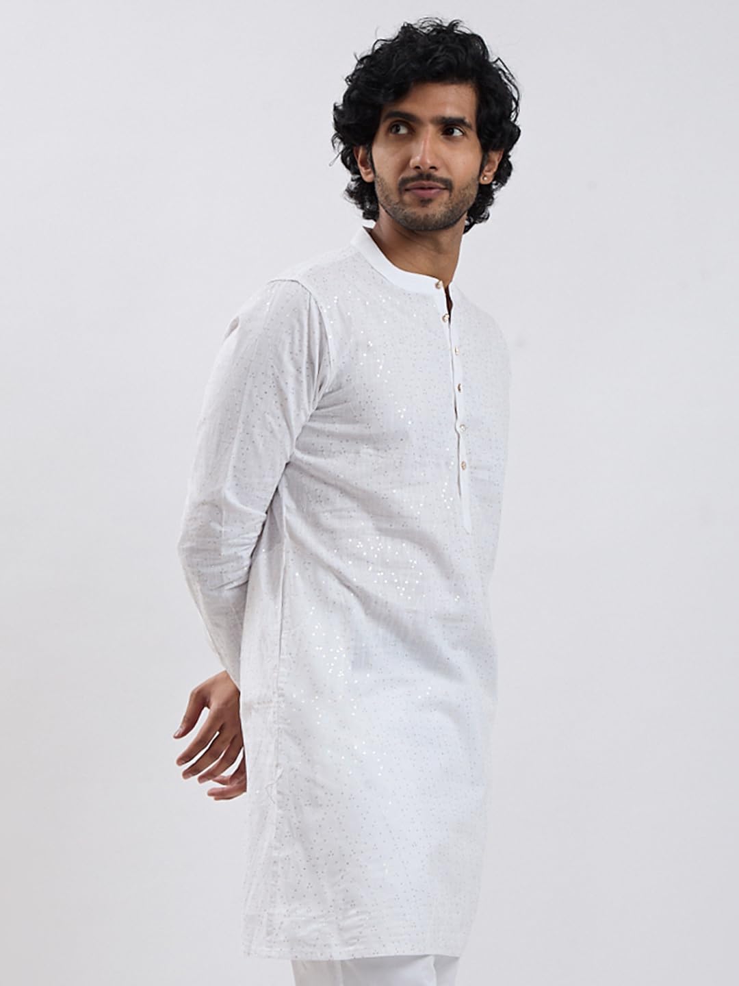 VASTRAMAY Men's White Cotton Kurta Sequined Kurta