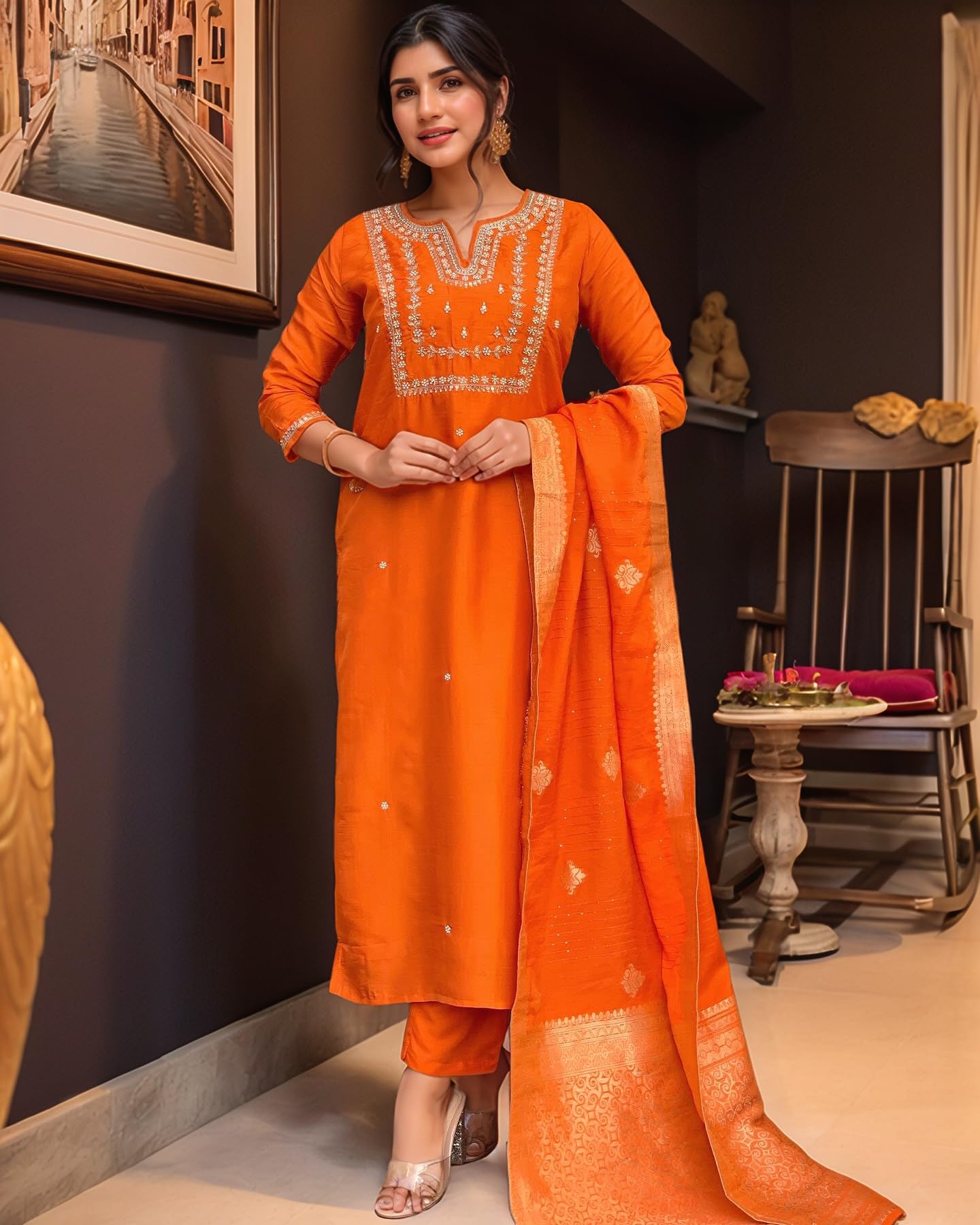 как выглядит GoSriKi Womens Silk Blend Straight Embroidered Kurta with Pant Dupatta фото