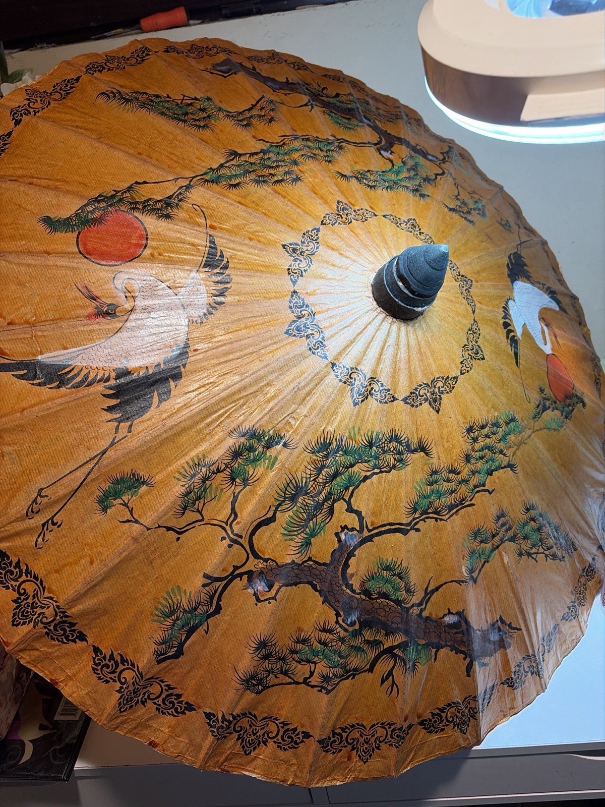 как выглядит Vintage Asian Hand Painted Paper Umbrella Cranes Pine Tree Design Japan фото