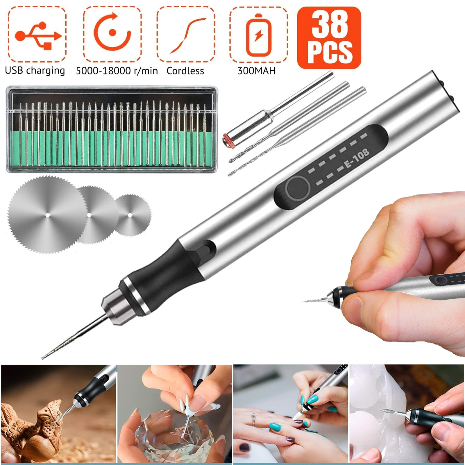 Set Includes: Drill bits, Electric engraving pen, Rotary bits, shank post, Stainless Steel Cutting Discs, USB