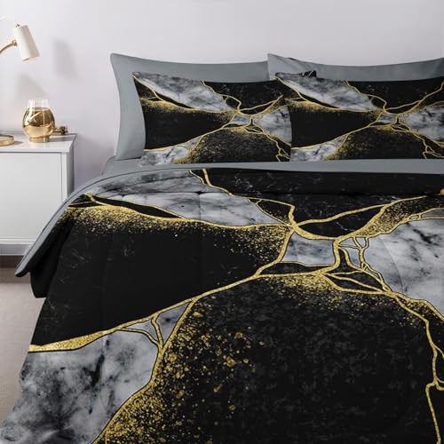 5 Pcs Comforter Set Size, Marble Black Gold Bedding Set for Twin Modern Marble