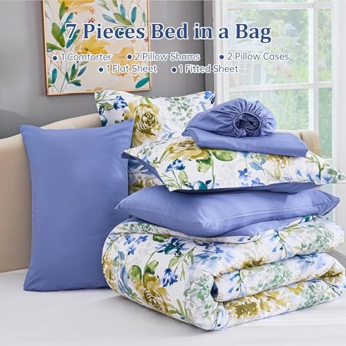 Floral Comforter Set Size 7 Pieces Bed in a Bag Flower Watercolor Queen Blue