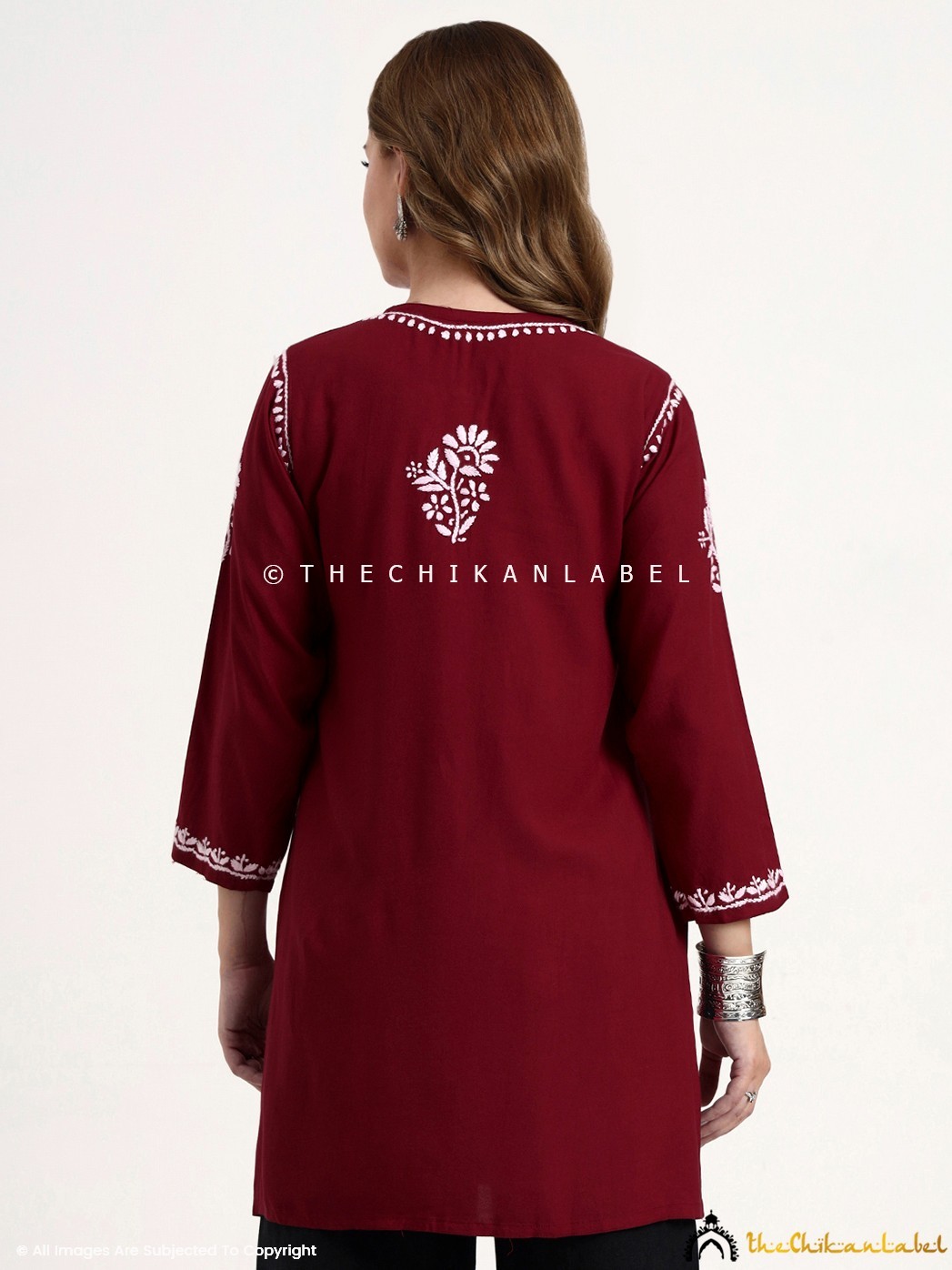 как выглядит Maroon Rayon Chikankari Short Kurta, Hand-Embroidered Short Kurti Top For Women фото