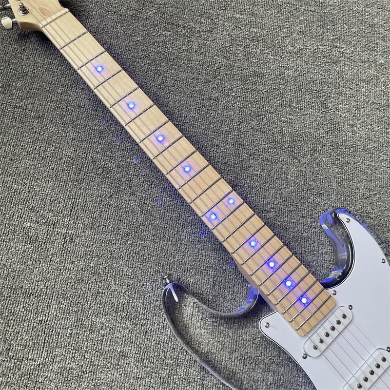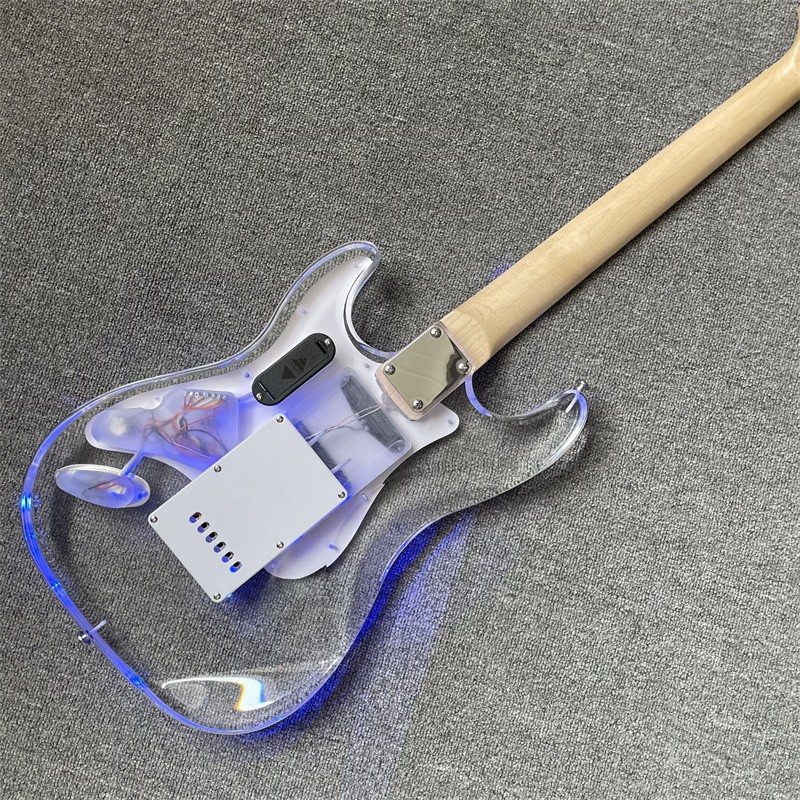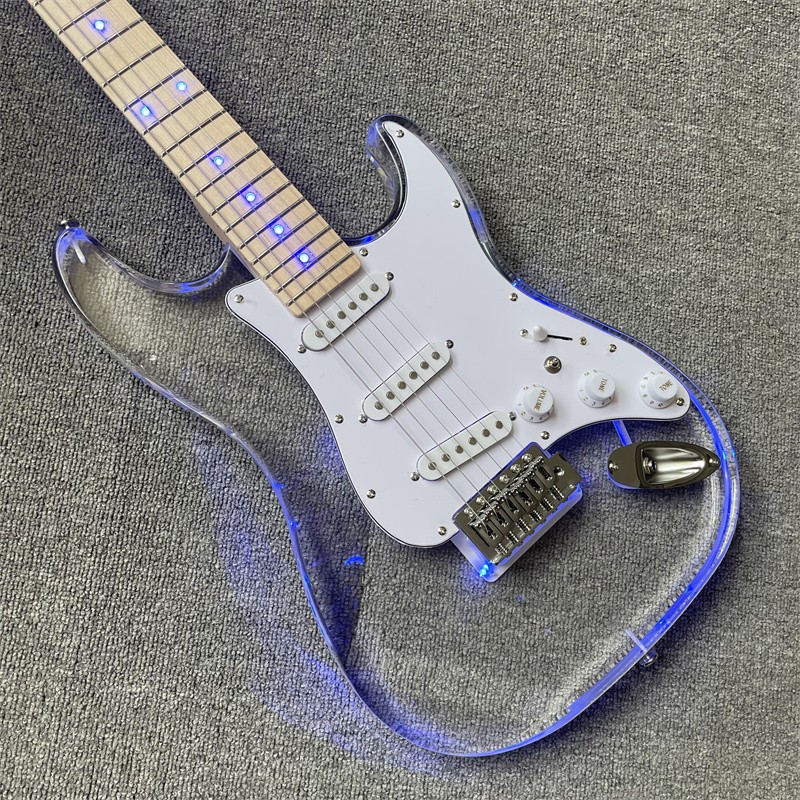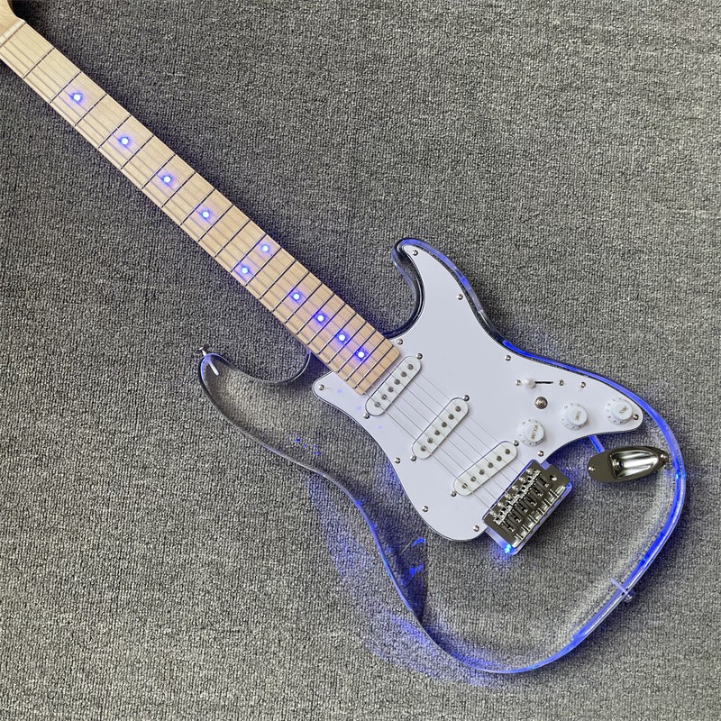 Blue Led Light Acrylic Crystal ST Electric Guitar Maple Neck Chrome Hardware
